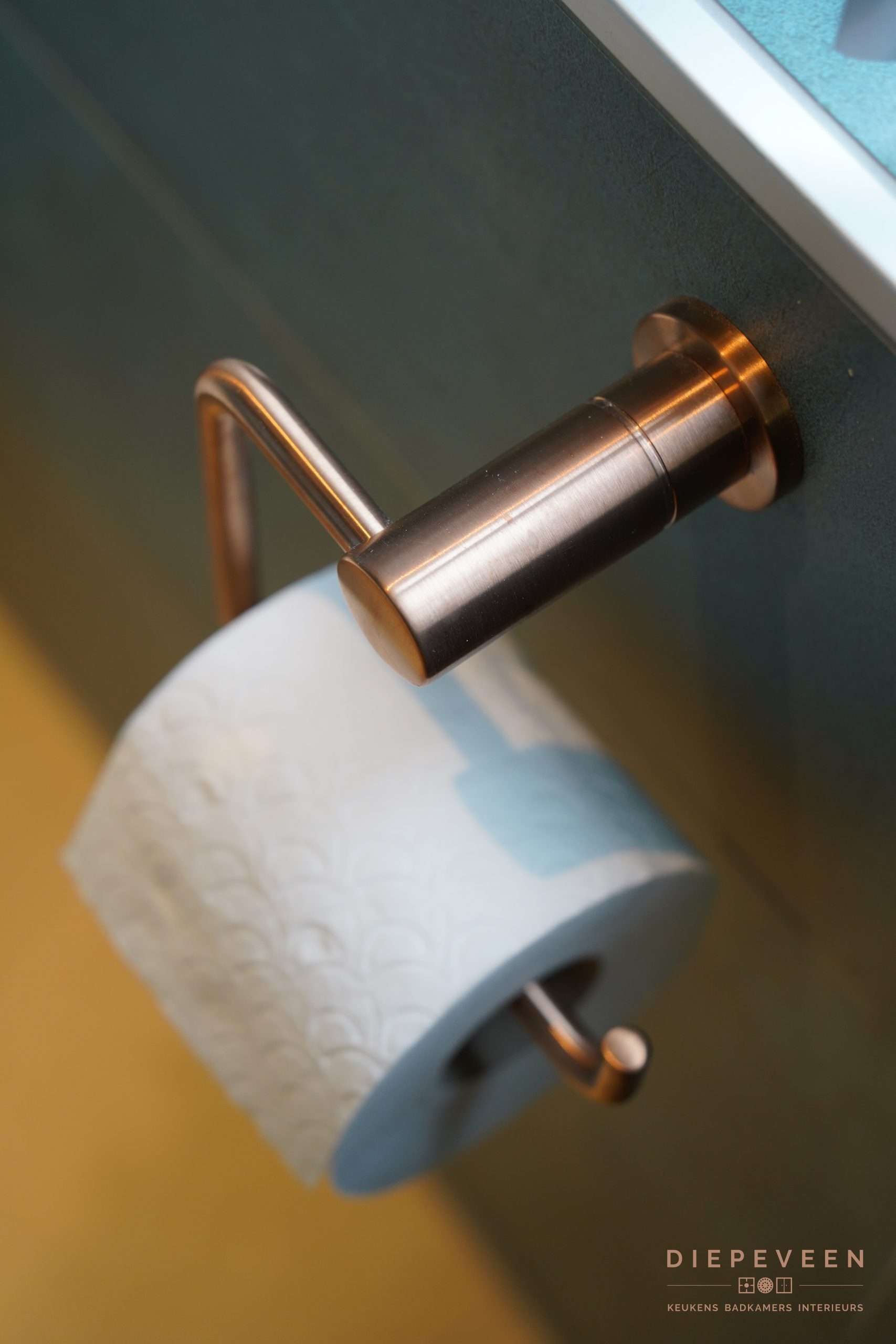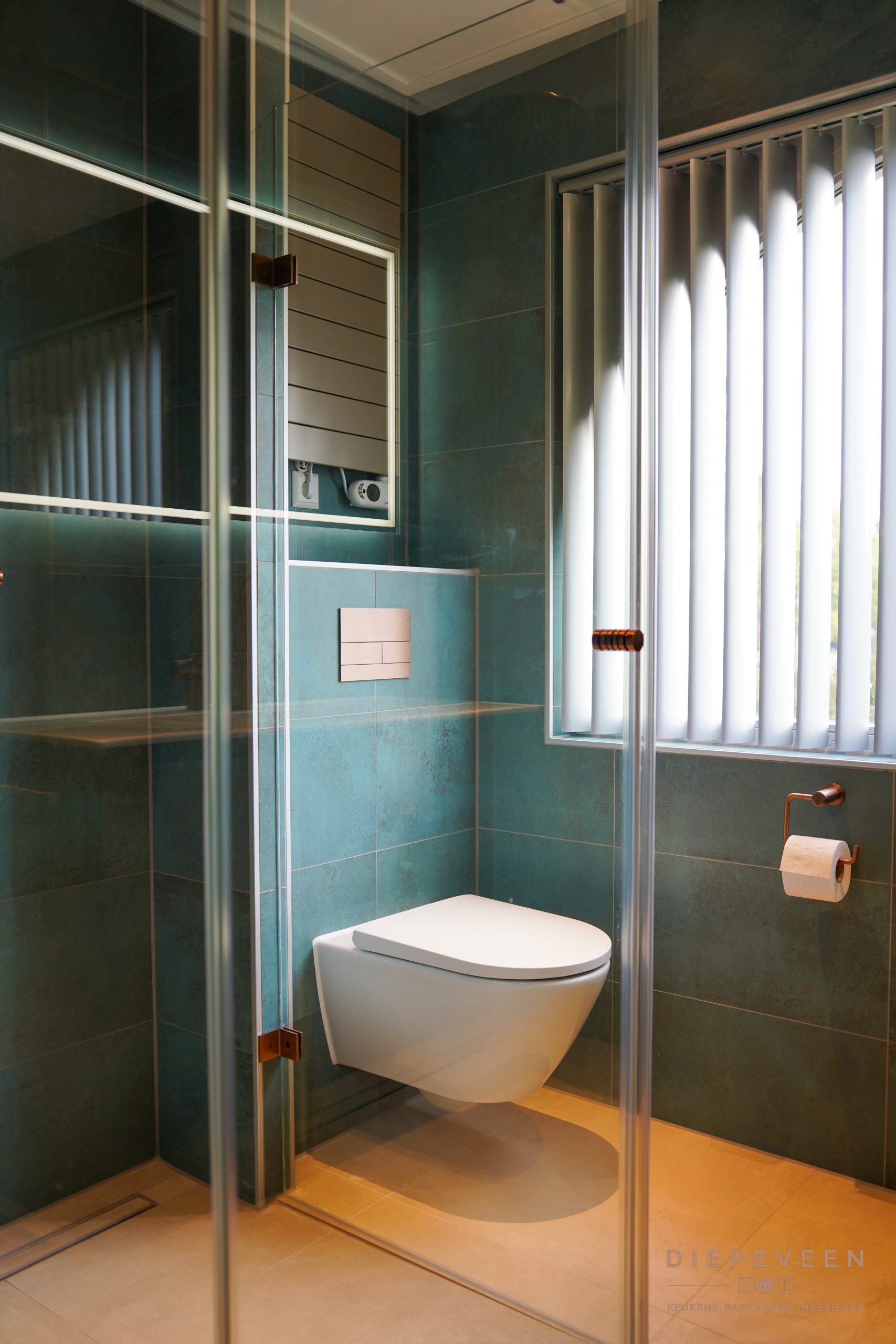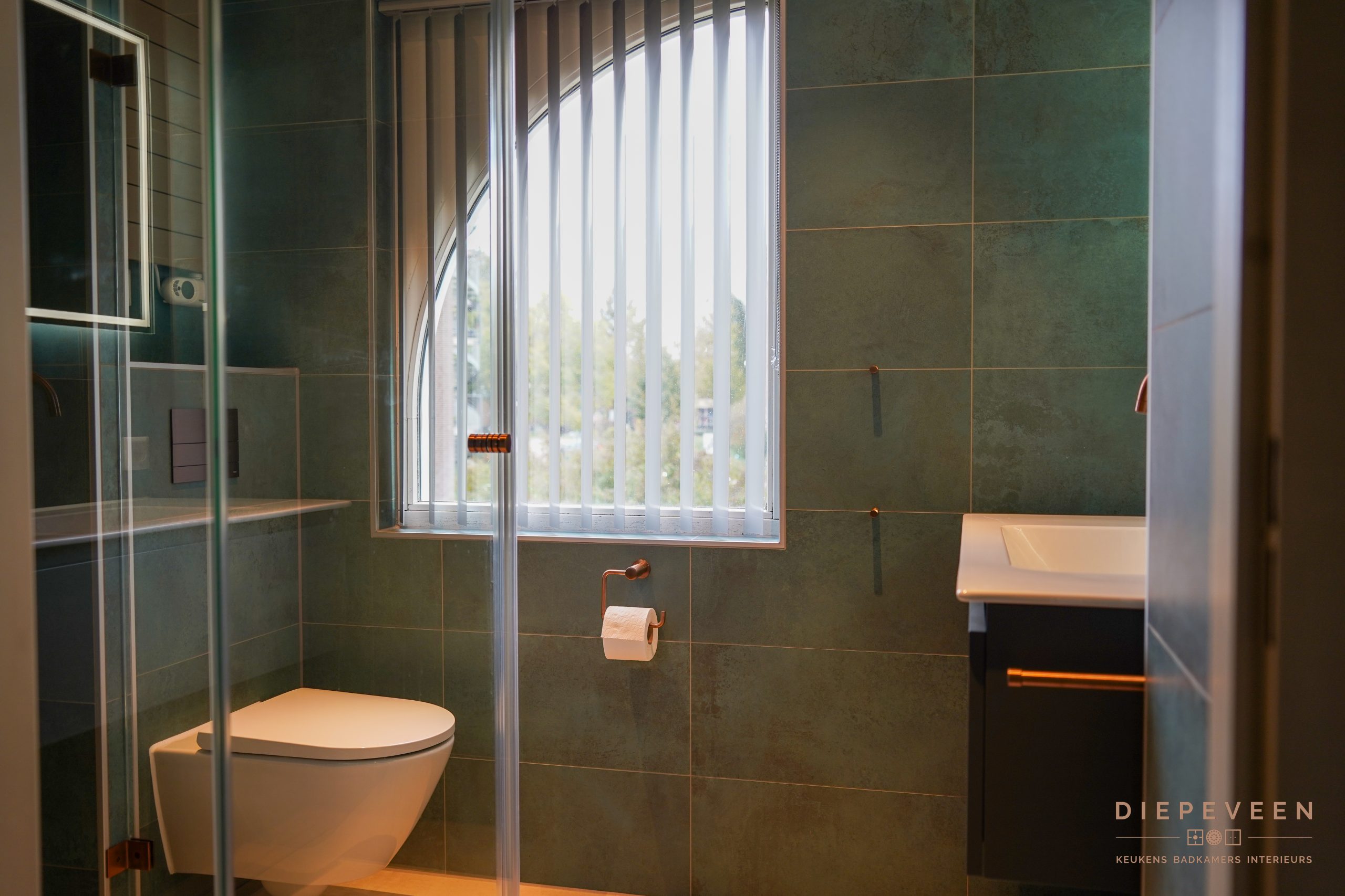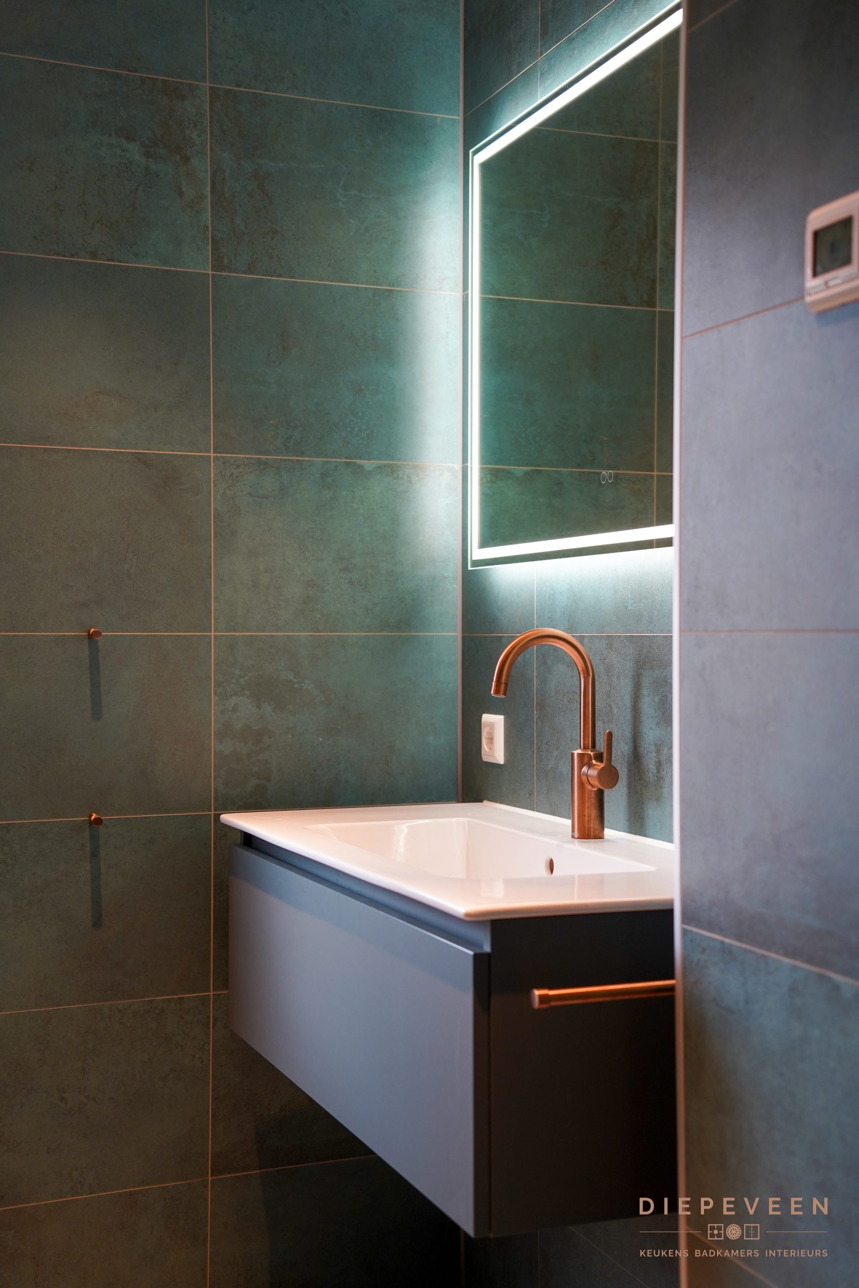 De groenblauwe tinten zorgen voor een rustige uitstraling, maar geven de badkamer tegelijk karakter. In combinatie met de koperen accenten en het warme licht krijgt het geheel nét dat beetje extra. Een fijne plek om de dag ontspannen te beginnen of af te sluiten.