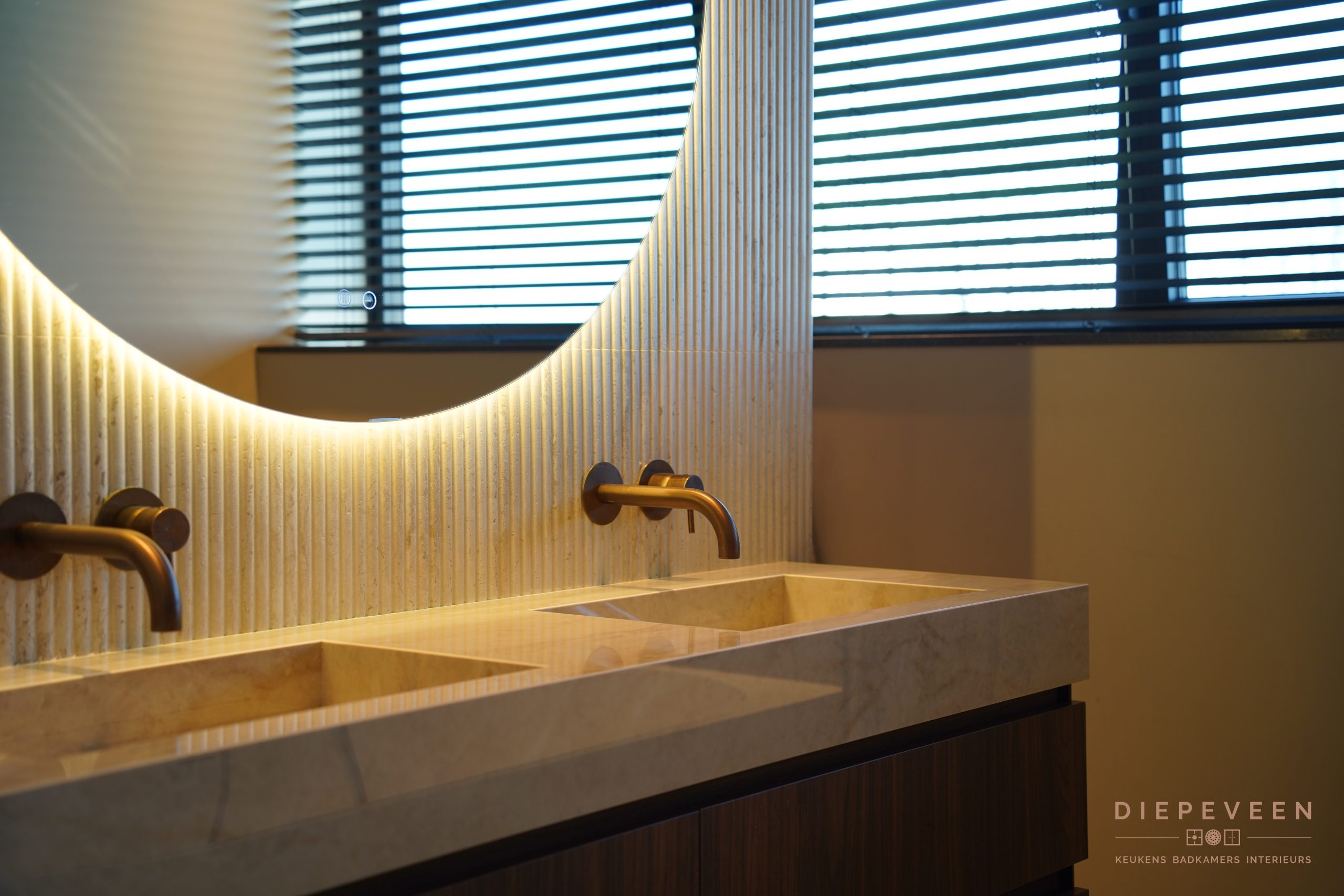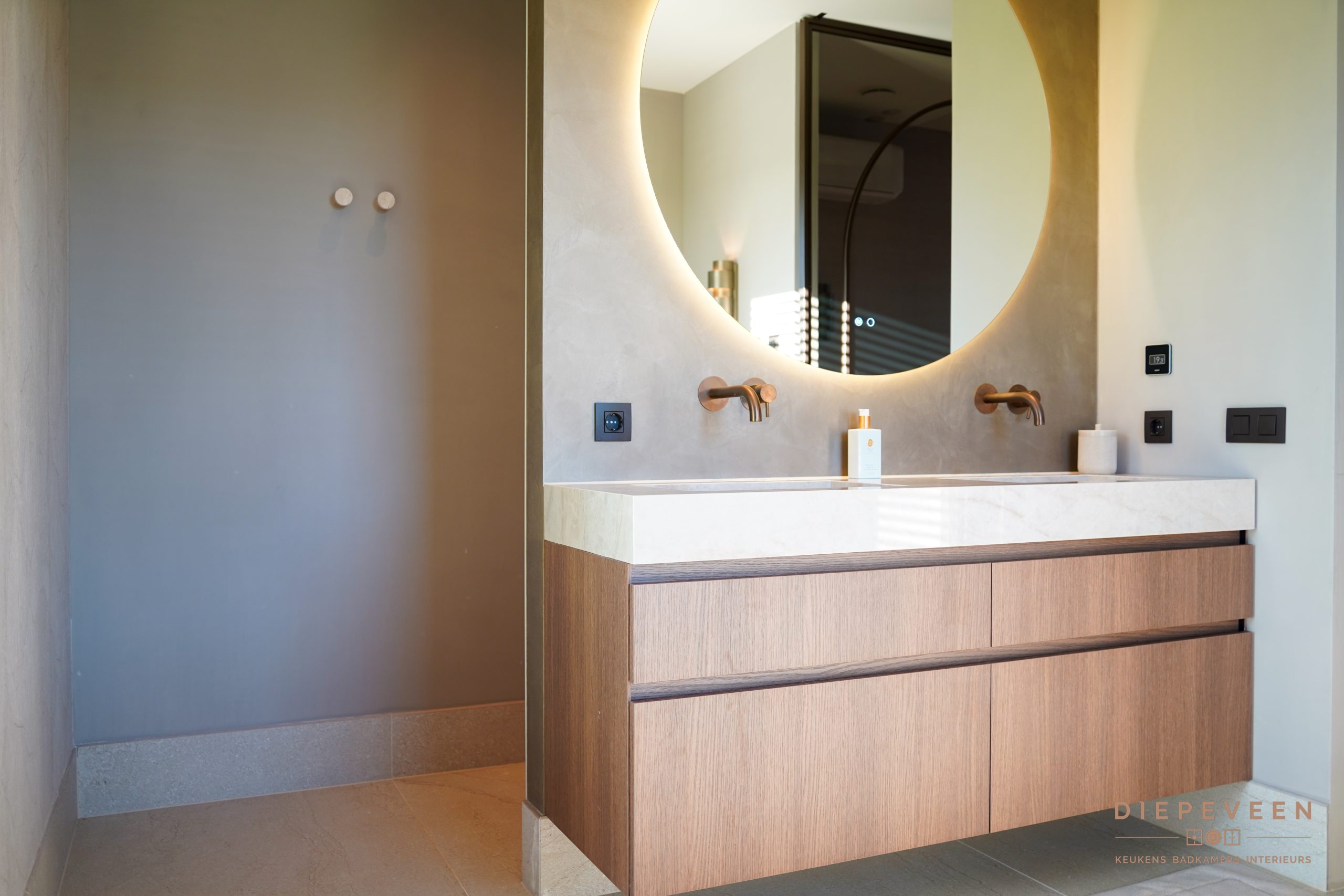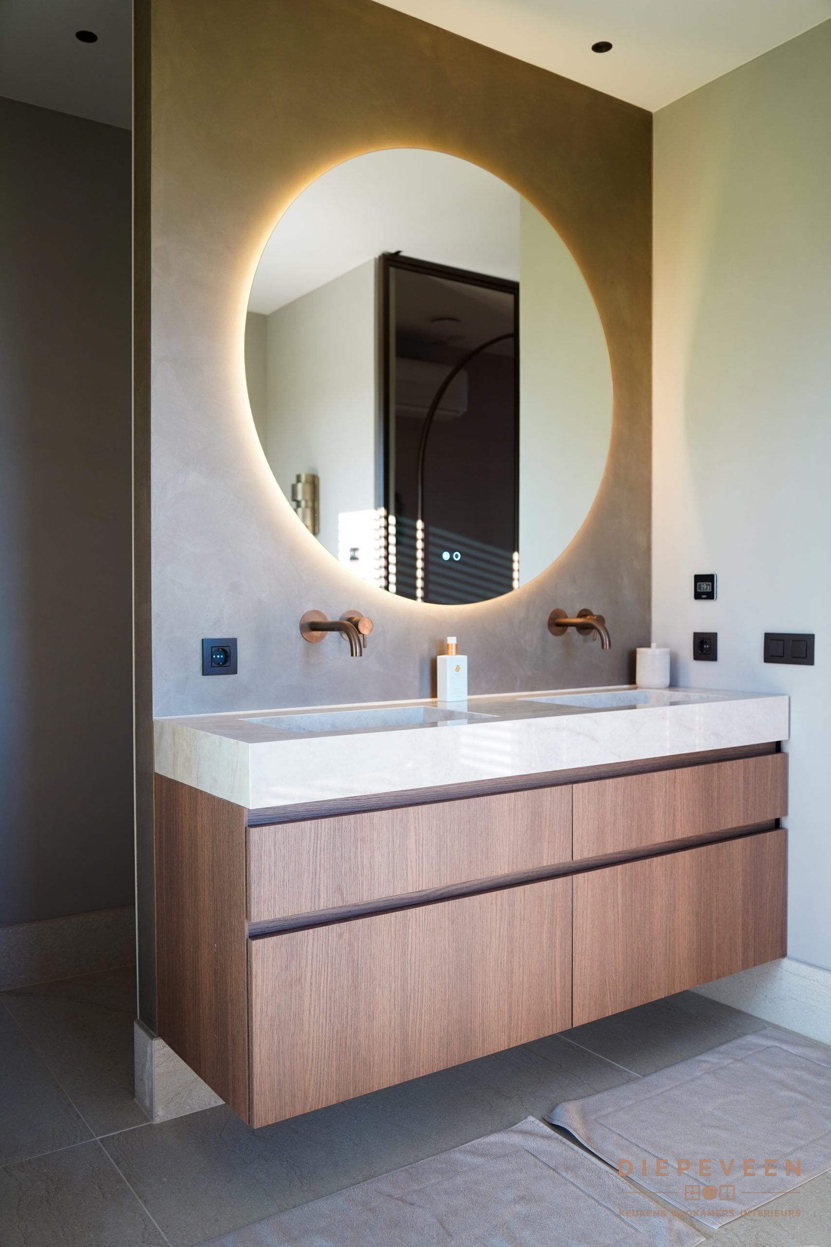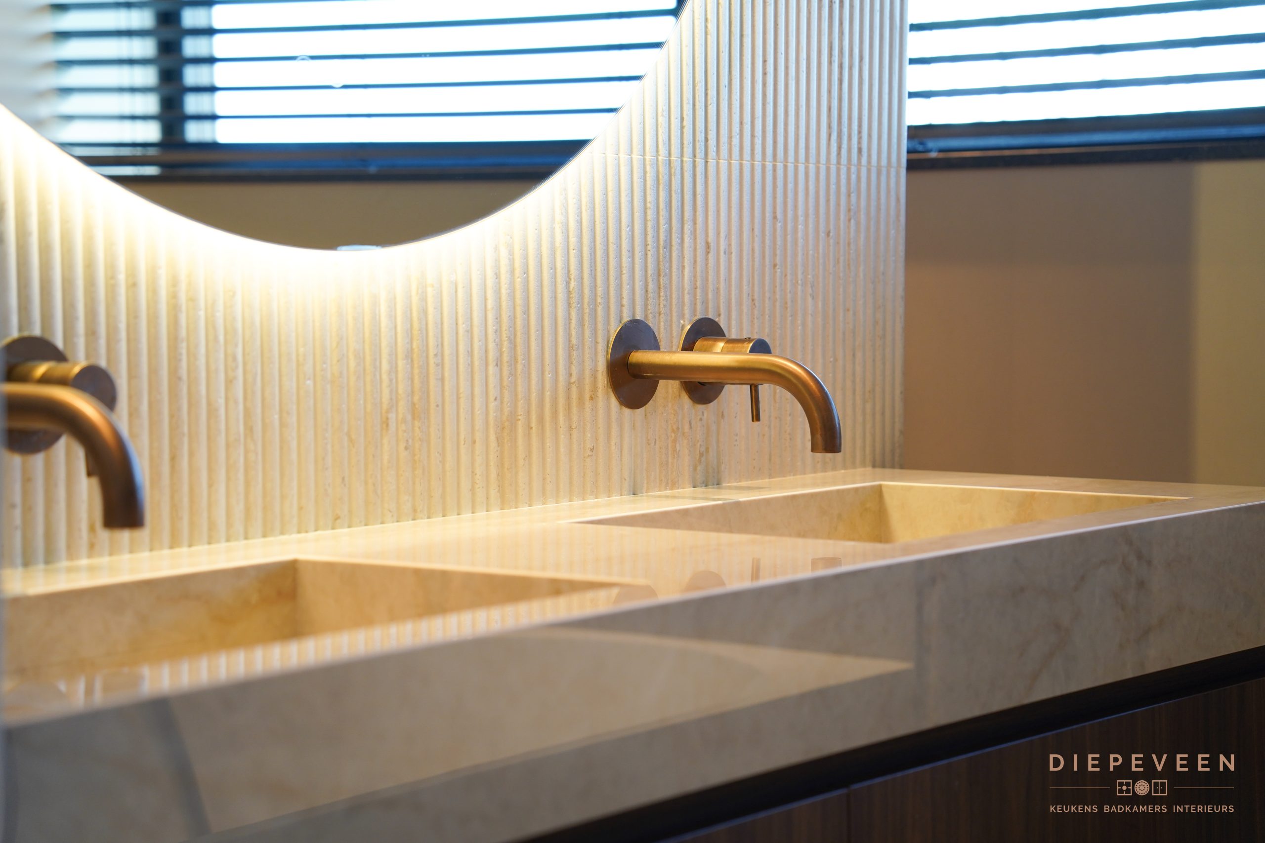 Dit is een prachtig voorbeeld van een chique badkamer, waarin luxe, design en zorgvuldig gekozen materialen samenkomen tot een stijlvol en indrukwekkend geheel.