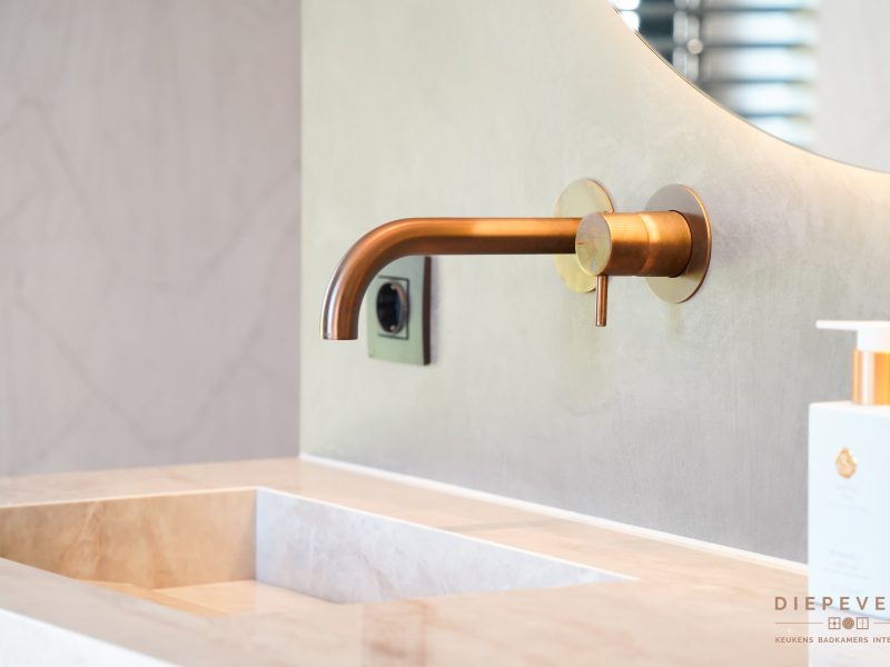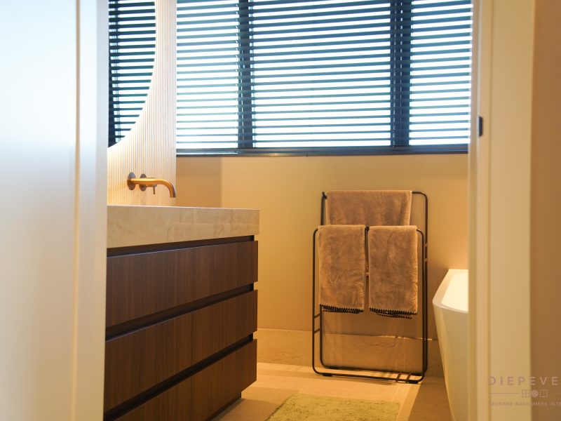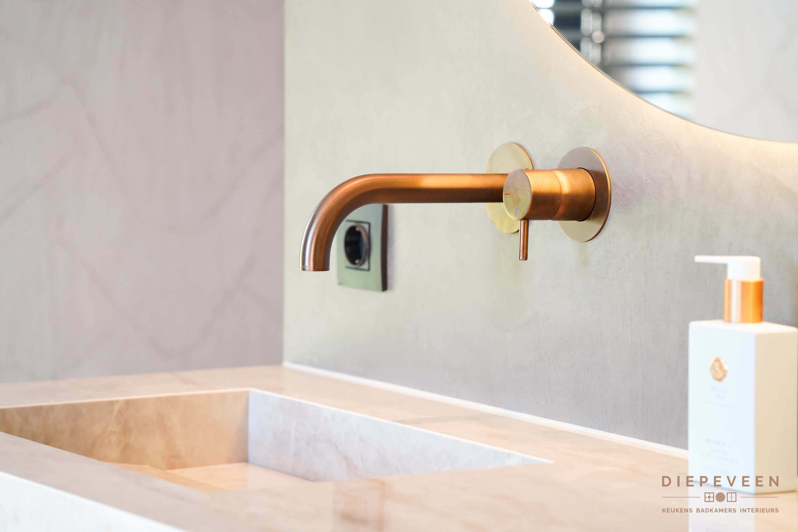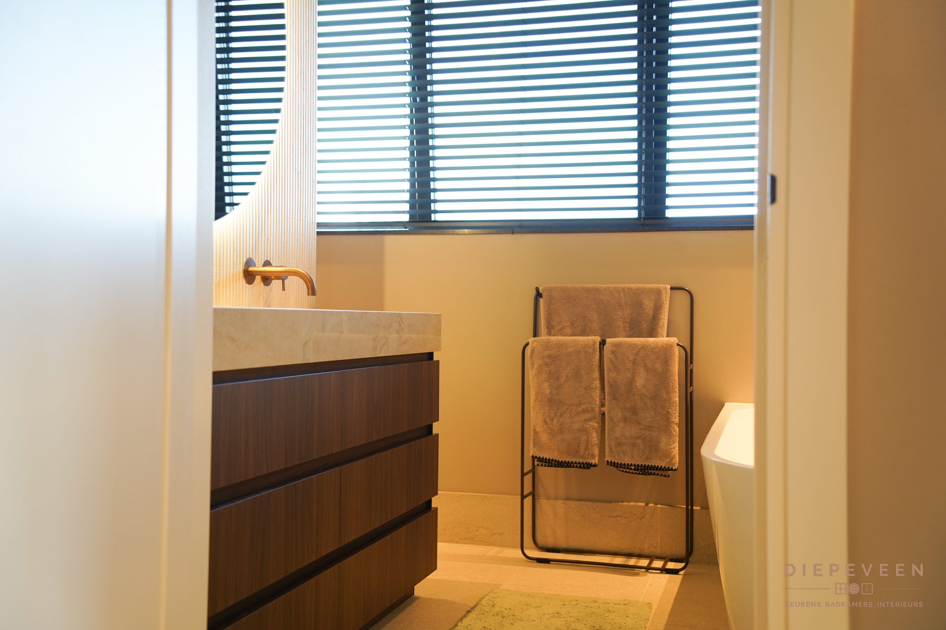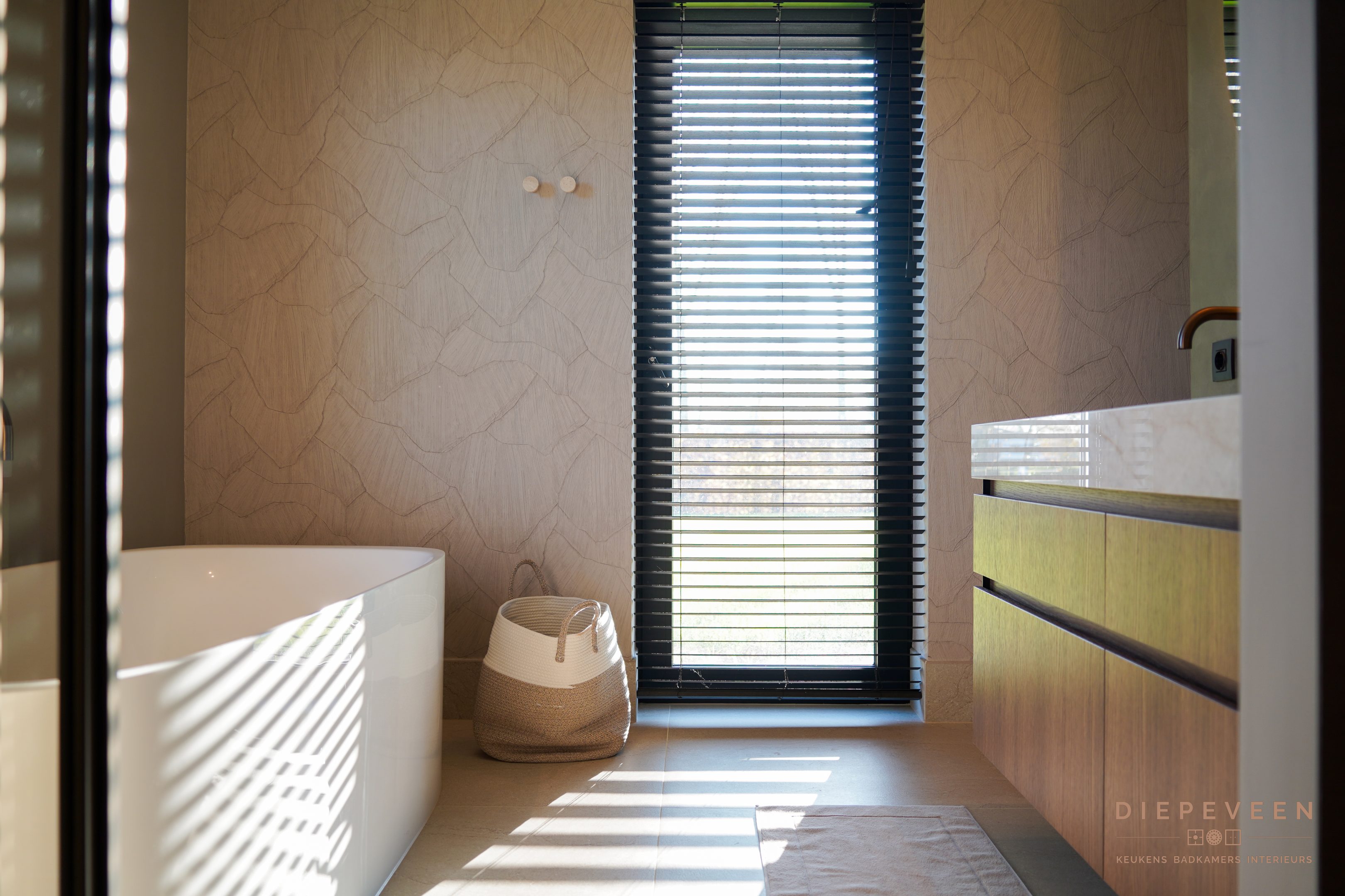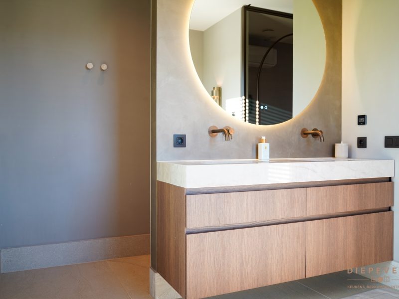 Dit is een prachtig voorbeeld van een chique badkamer, waarin luxe, design en zorgvuldig gekozen materialen samenkomen tot een stijlvol en indrukwekkend geheel.