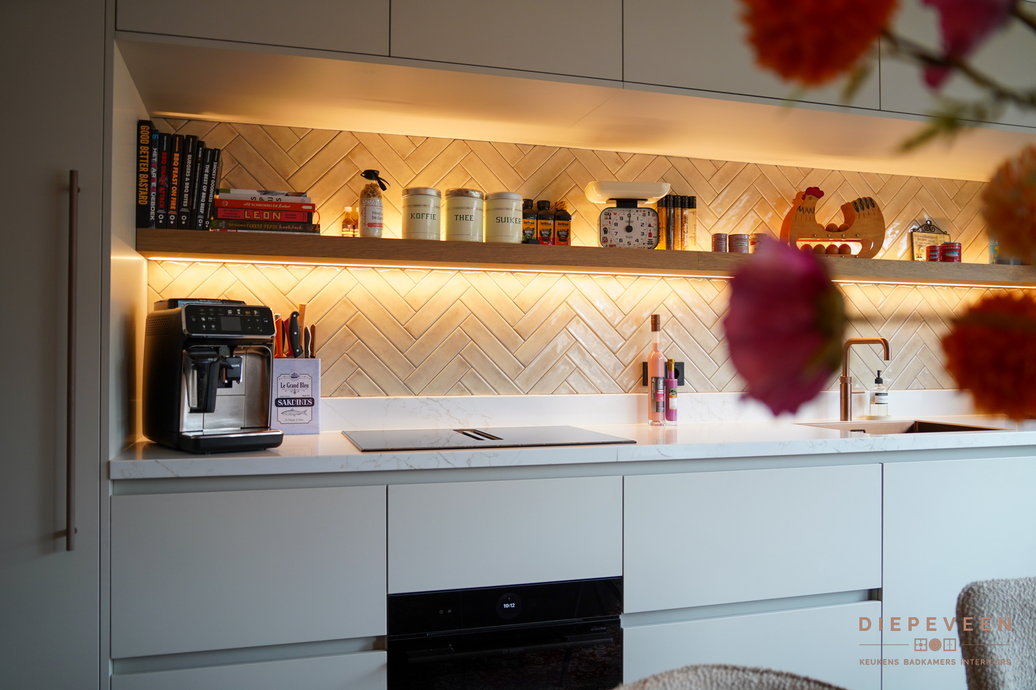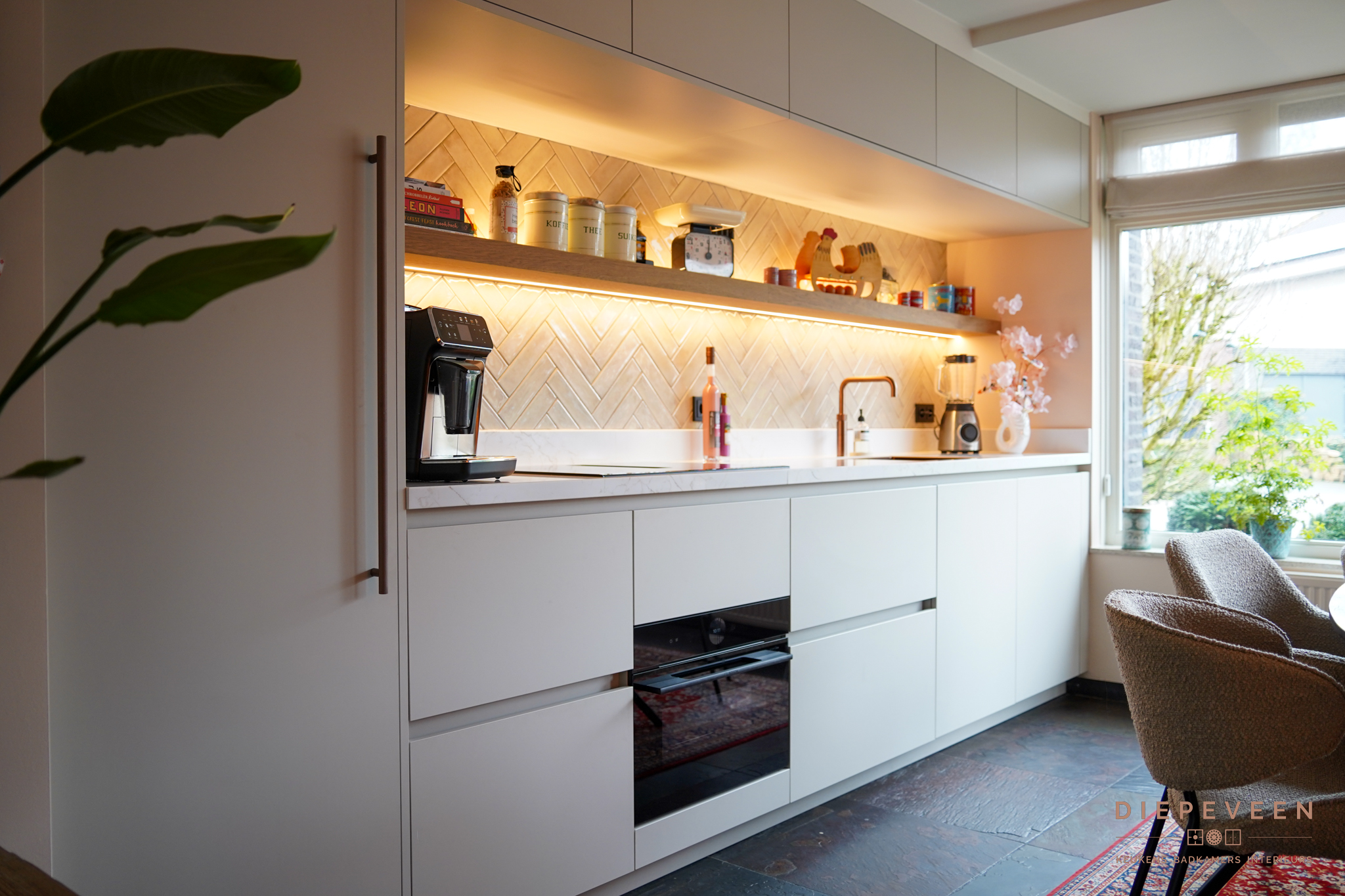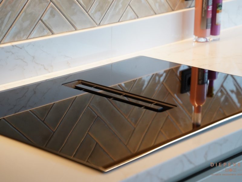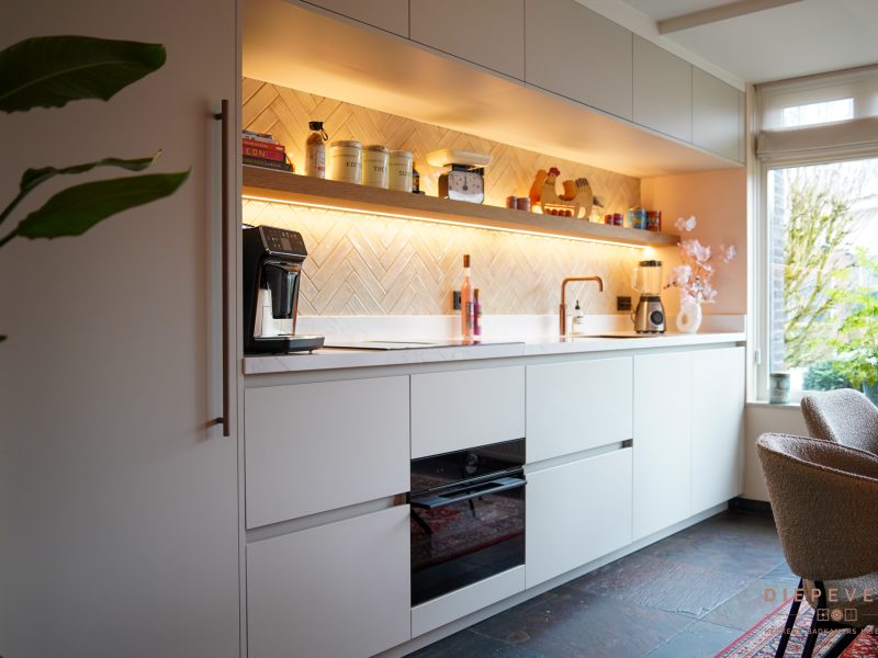 Een compacte keuken saai? Absoluut niet, en daar is dit een prachtig voorbeeld van! Hier is optimaal gebruik gemaakt van de ruimte en resulteert hier in een stijl en sfeervolle ruimte, het totaal plaatje klopt helemaal. Prachtige details, en aan alles is gedacht. De speelse tegels en verlichting zorgen voor een ware eyecatcher. Eigenlijk kunnen we nog zoveel benoemen, maar kijk vooral naar de foto’s en geniet van deze speelse en gezellige keuken.