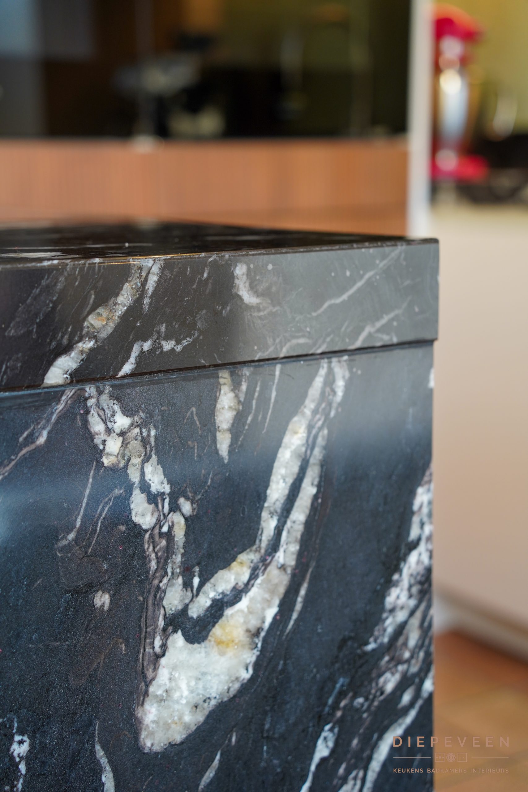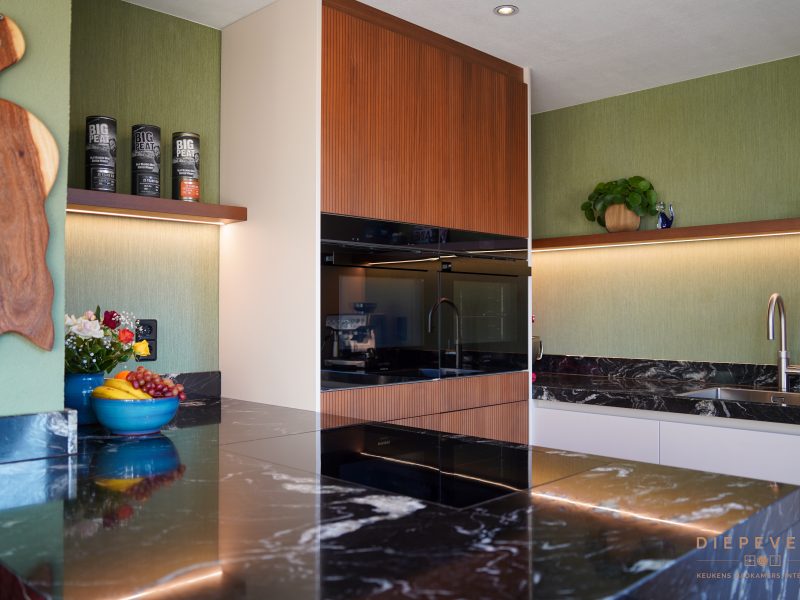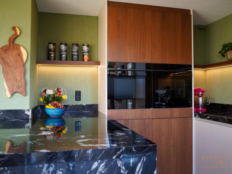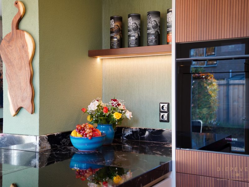 Het werkblad loopt mooi door aan de zijkant, de materialen sluiten perfect op elkaar aan en alles is afgestemd op de ruimte.