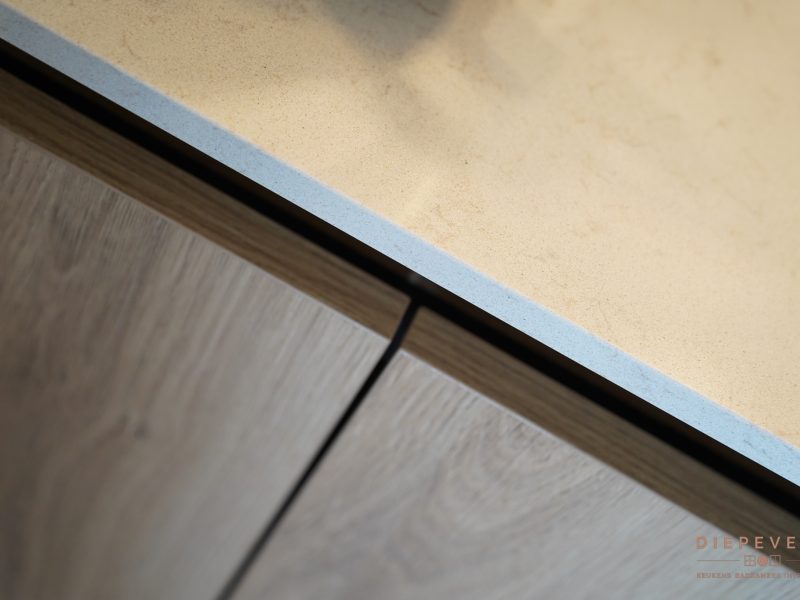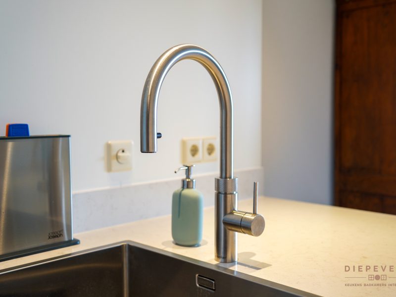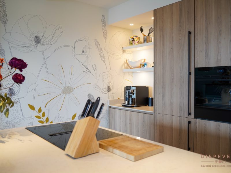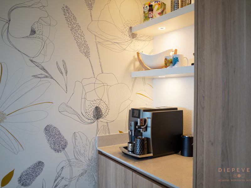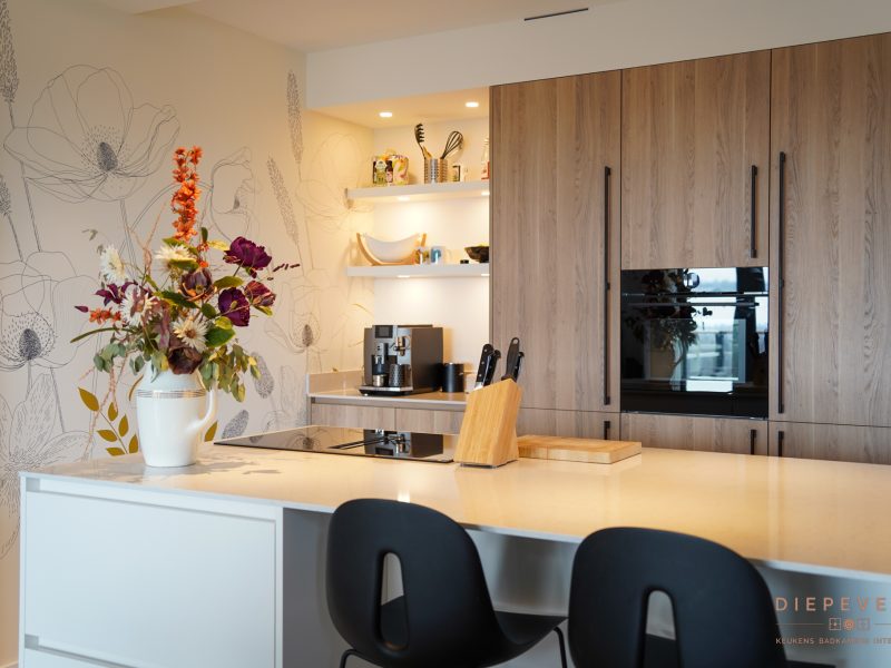 Wat een heerlijk fris eindresultaat, een lichte keuken is tijdloos en elegant en oogt lekker fris. Een gezellig zitje met donkere krukken die er mooi uitspringen en terugkomen in de grepen. Een mooie koffienis met prachtige verlichting maakt het plaatje compleet. Een heerlijke lichte leefkeuken, dat is puur genieten!