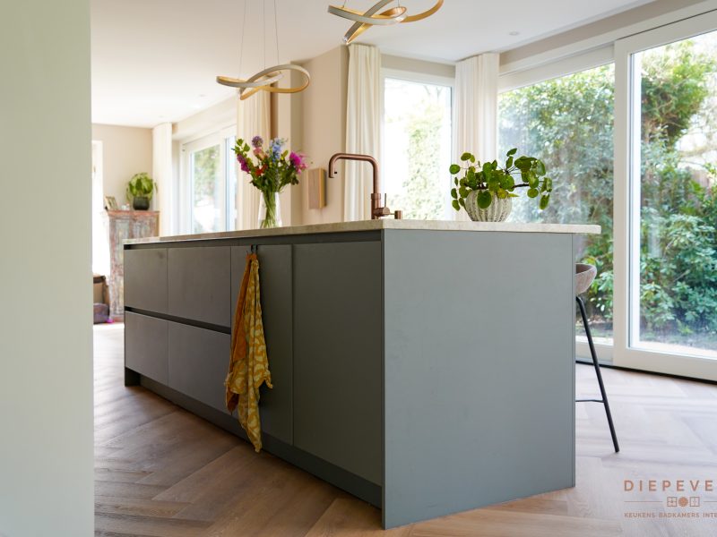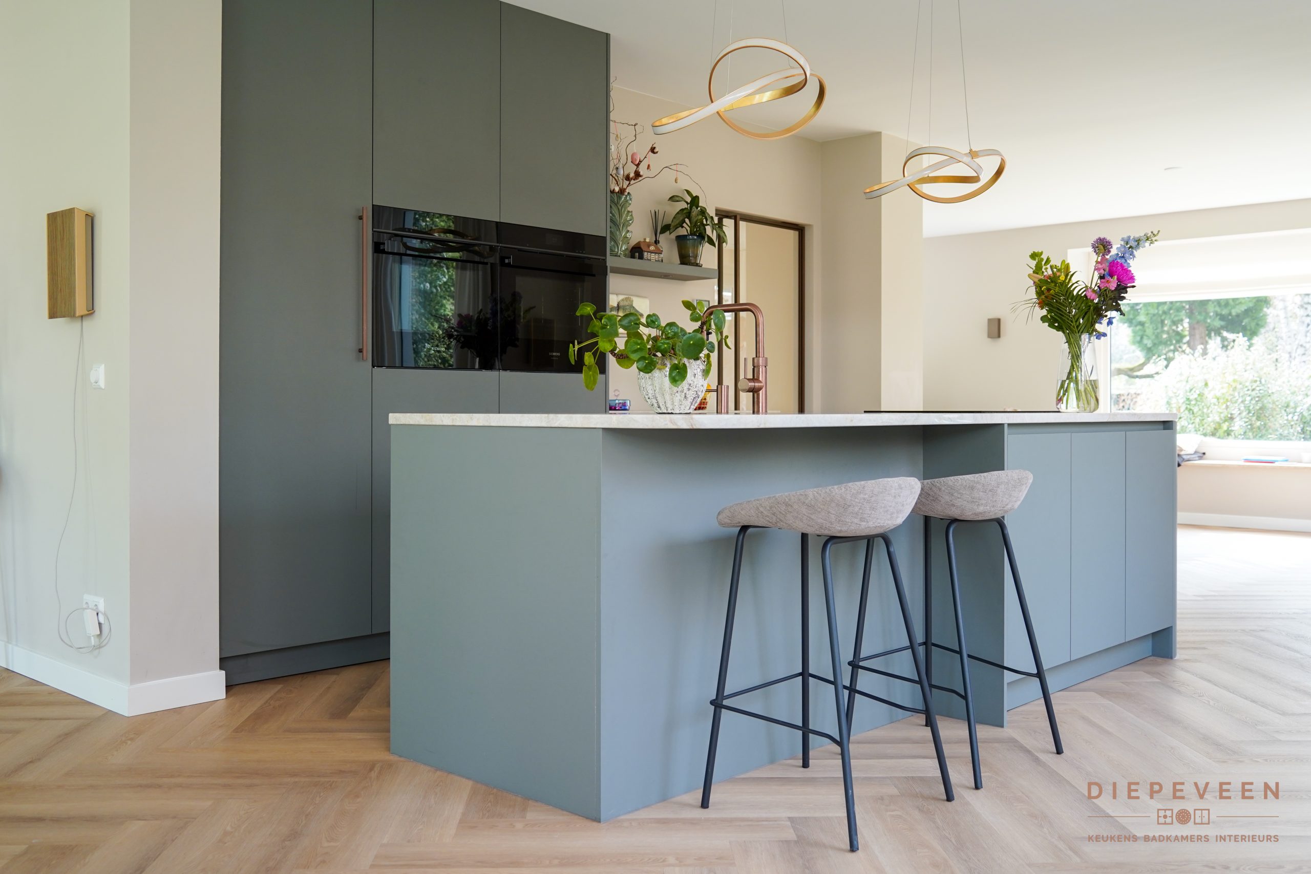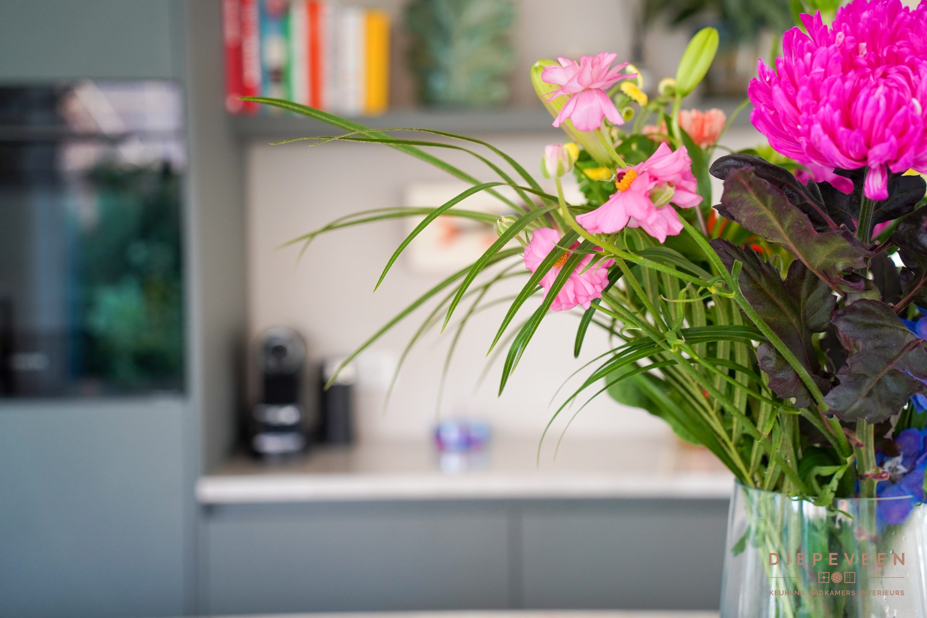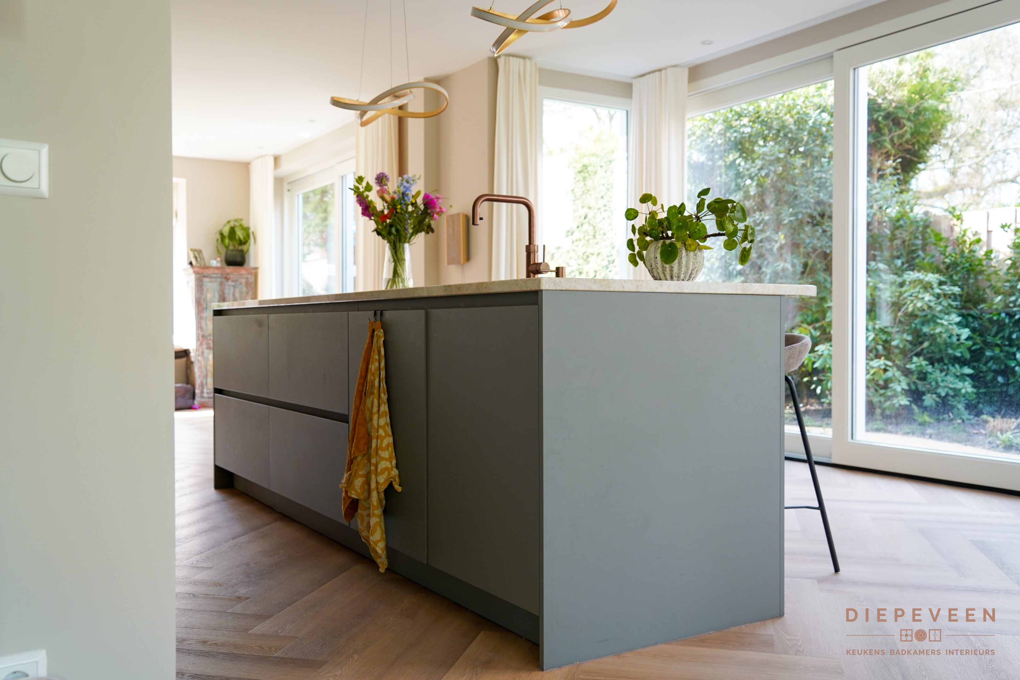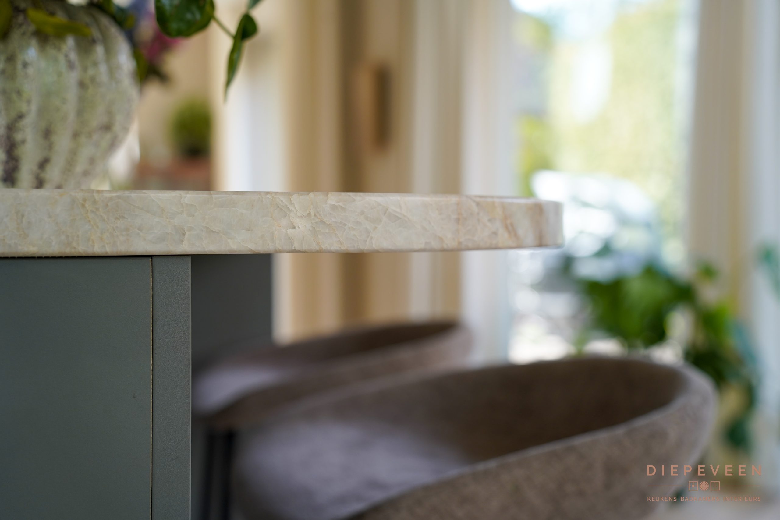 Deze frisse en moderne keuken hebben wij onlangs mogen realiseren in Hilversum. Wat een prachtige kleur, het valt onder de grijze kleurgroep en matcht perfect in vele tinten. Hier is gekozen voor een stijlvol natuurstenen blad in de kleur Taj Mahal en apparatuur van Siemens. De prachtige rosé koperen Quooker kraan past perfect in het geheel. Het eiland is uitgevoerd aan 1 kant met rondingen, een moderne stijlvolle keuken, helemaal in de stijl van nu! Een prachtig eindresultaat, genieten!