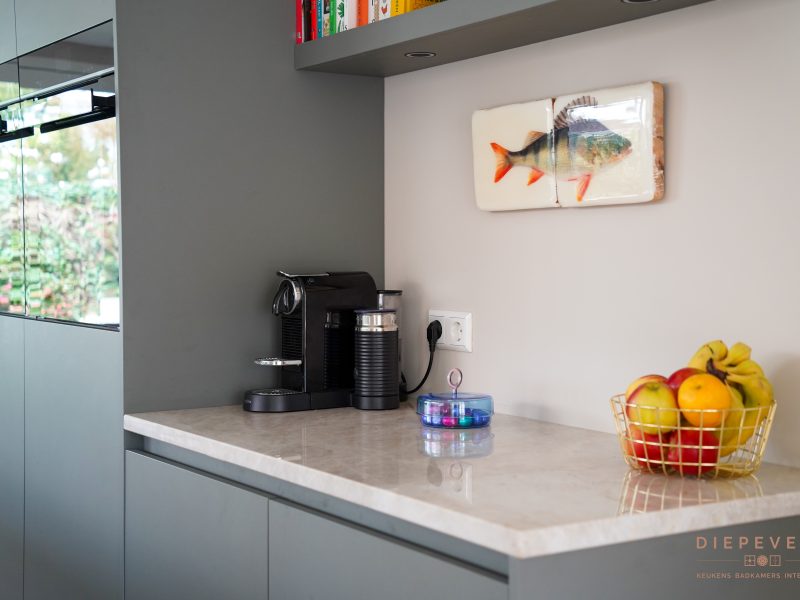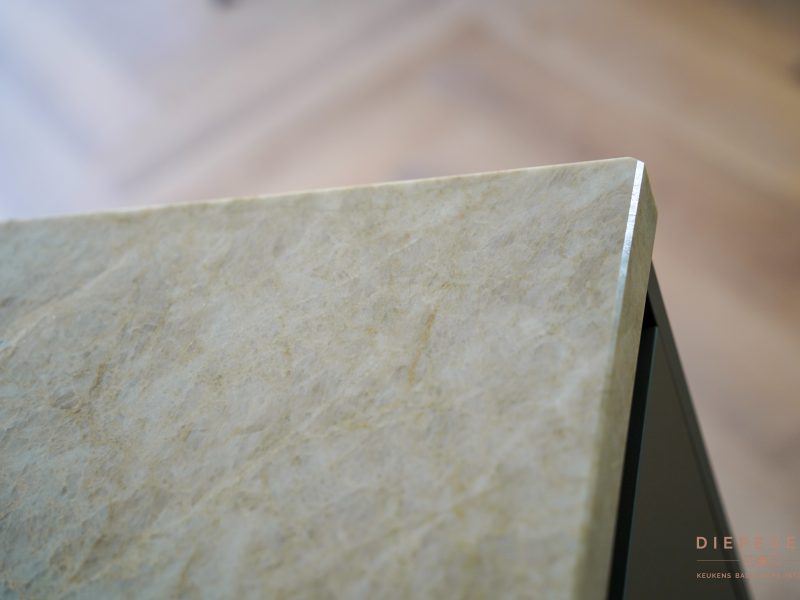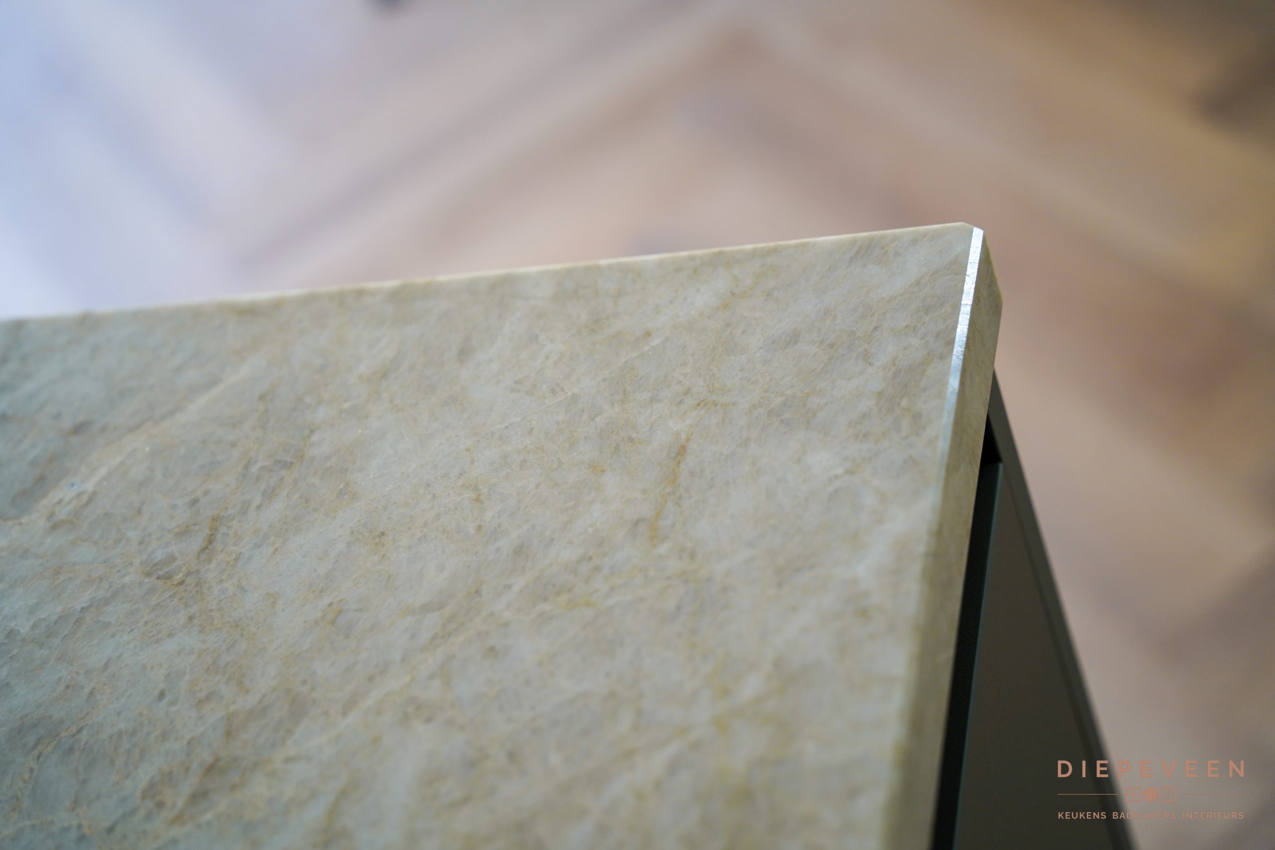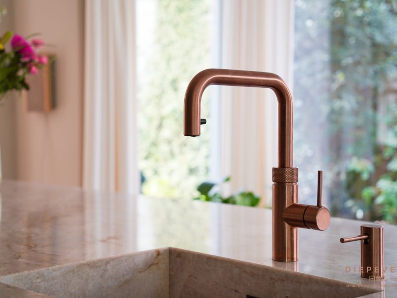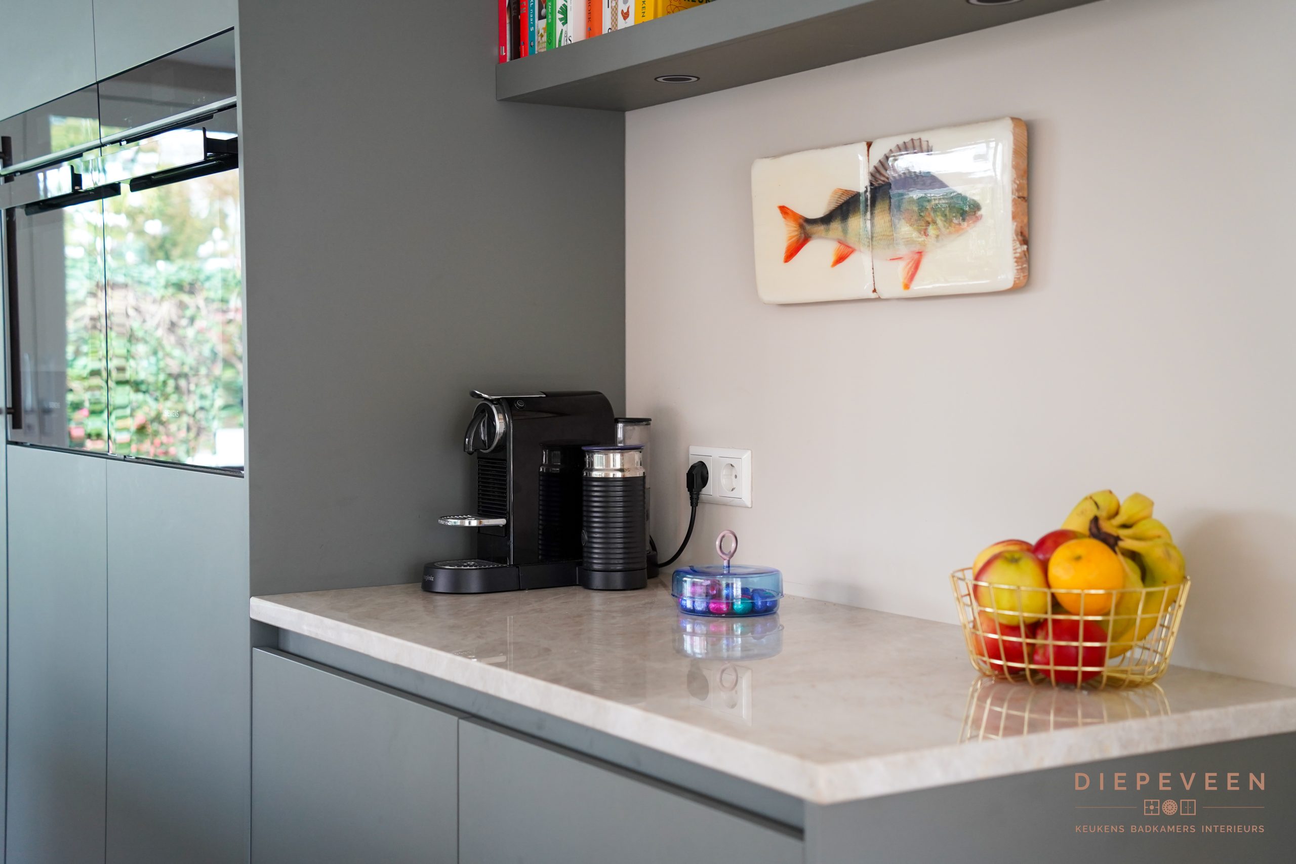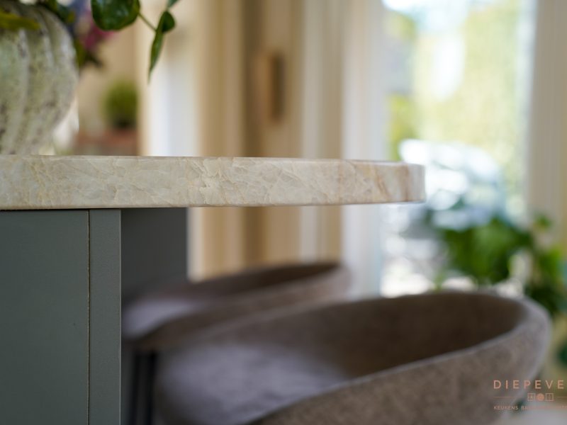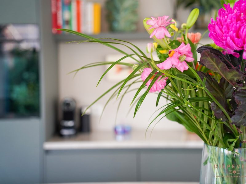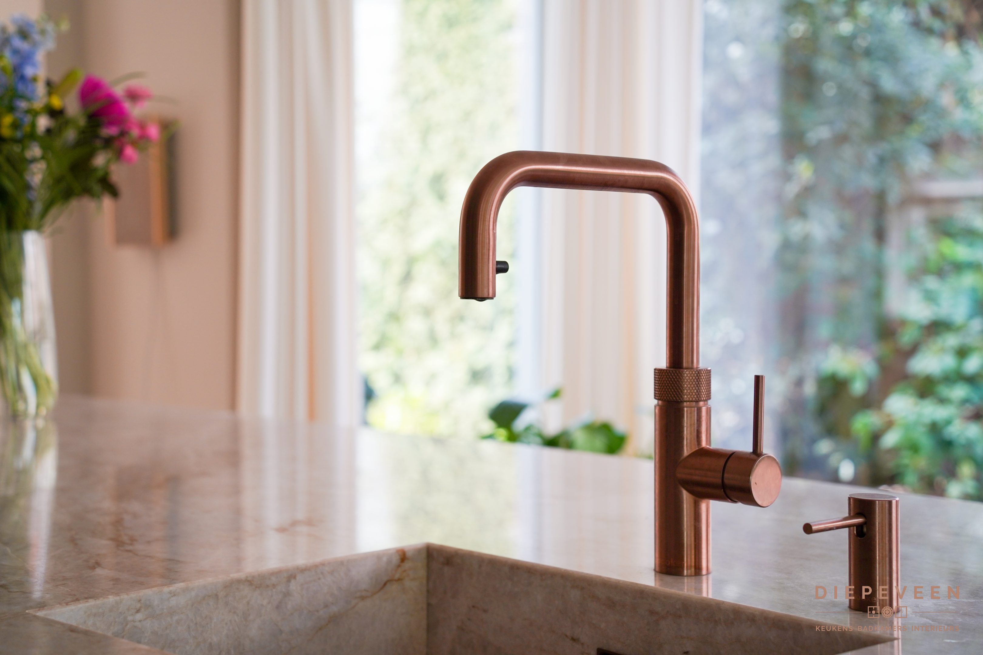 Deze frisse en moderne keuken hebben wij onlangs mogen realiseren in Hilversum. Wat een prachtige kleur, het valt onder de grijze kleurgroep en matcht perfect in vele tinten. Hier is gekozen voor een stijlvol natuurstenen blad in de kleur Taj Mahal en apparatuur van Siemens. De prachtige rosé koperen Quooker kraan past perfect in het geheel. Het eiland is uitgevoerd aan 1 kant met rondingen, een moderne stijlvolle keuken, helemaal in de stijl van nu! Een prachtig eindresultaat, genieten!
