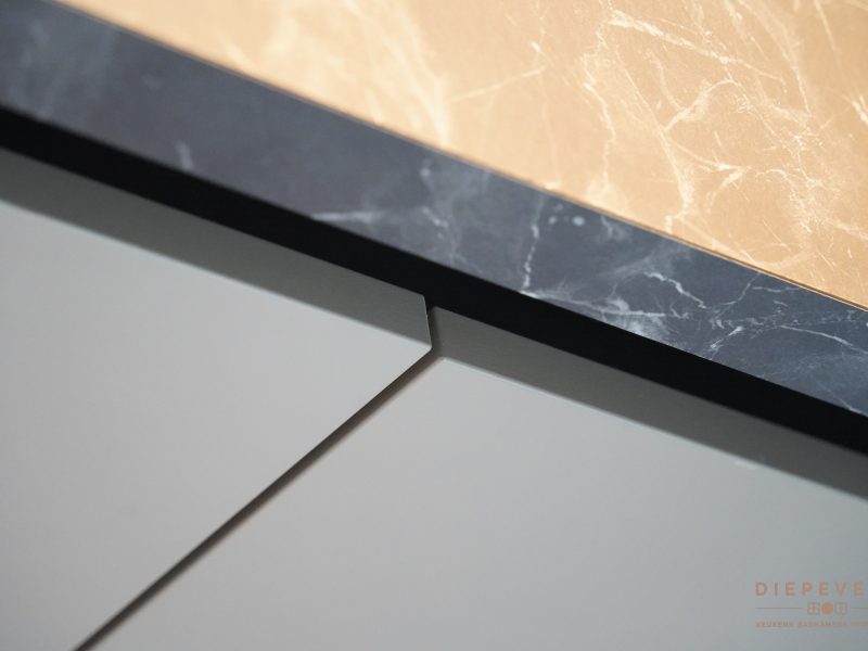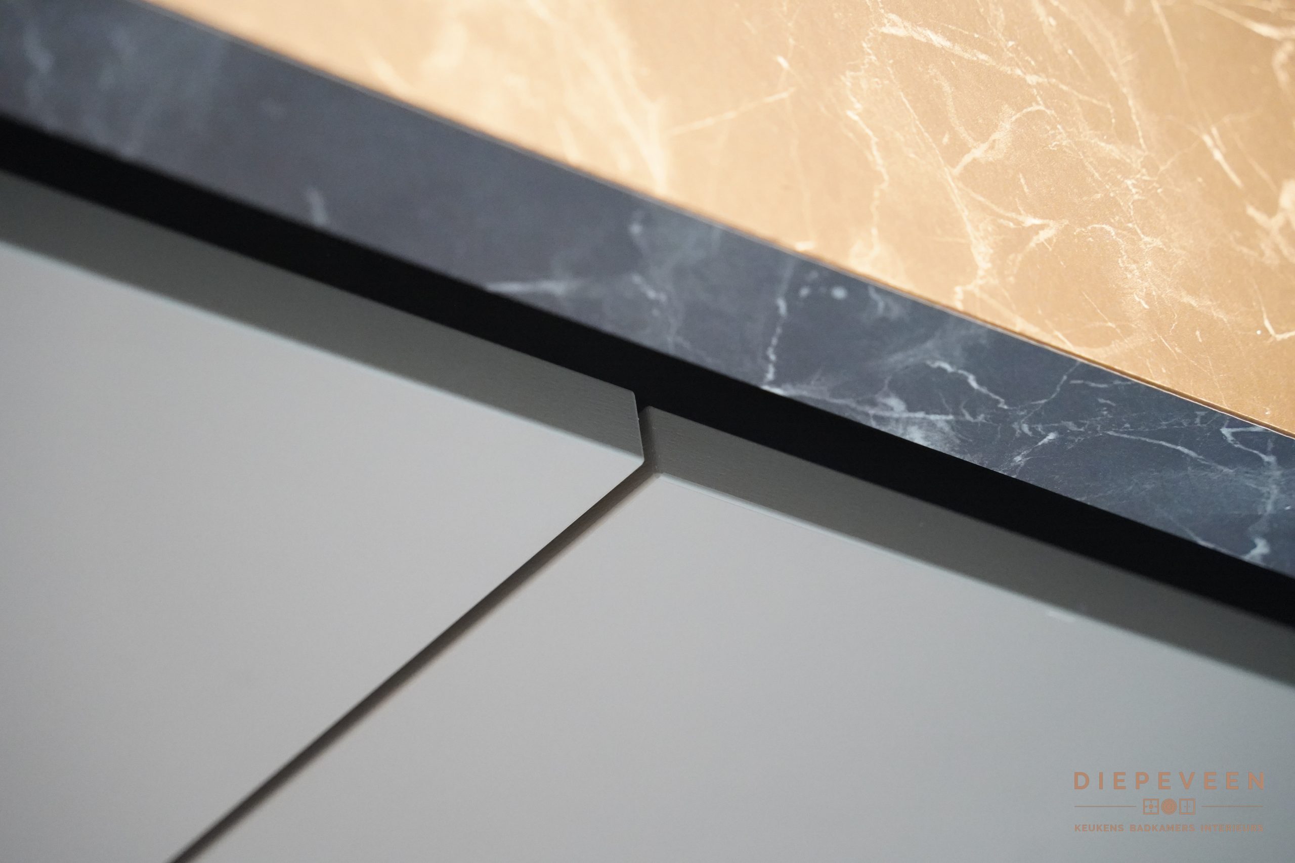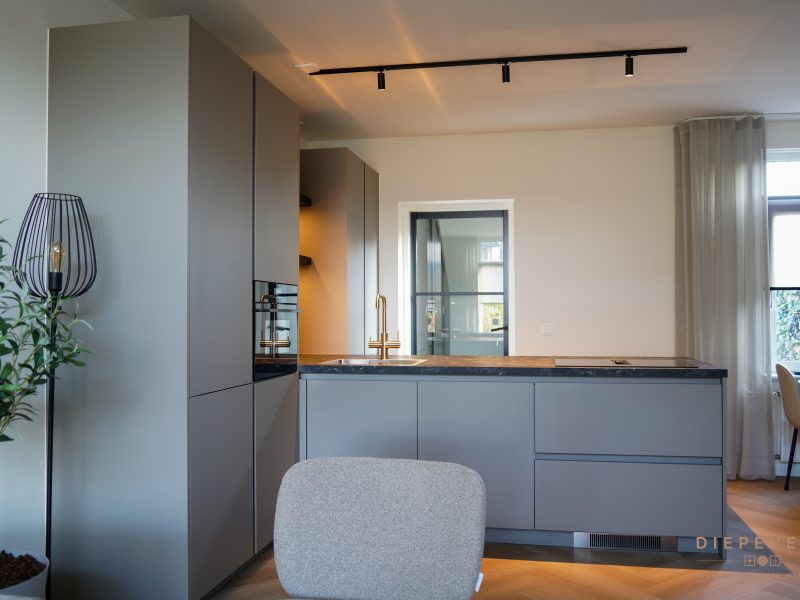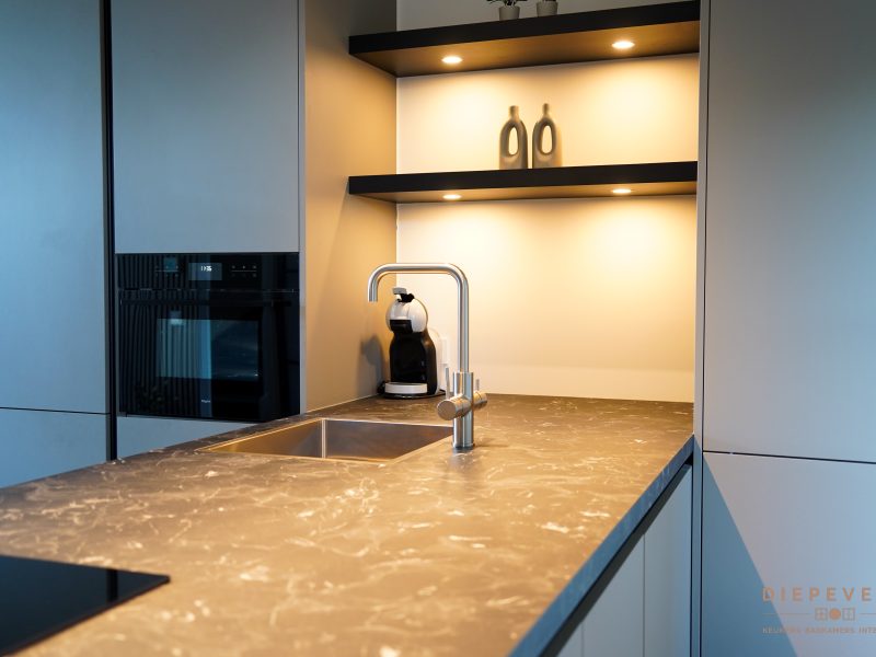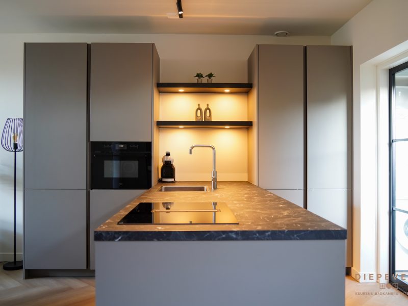 Door de greeploze kasten oogt het geheel strak en rustig. De wandplanken met verlichting zorgen voor extra sfeer én fijn werklicht.