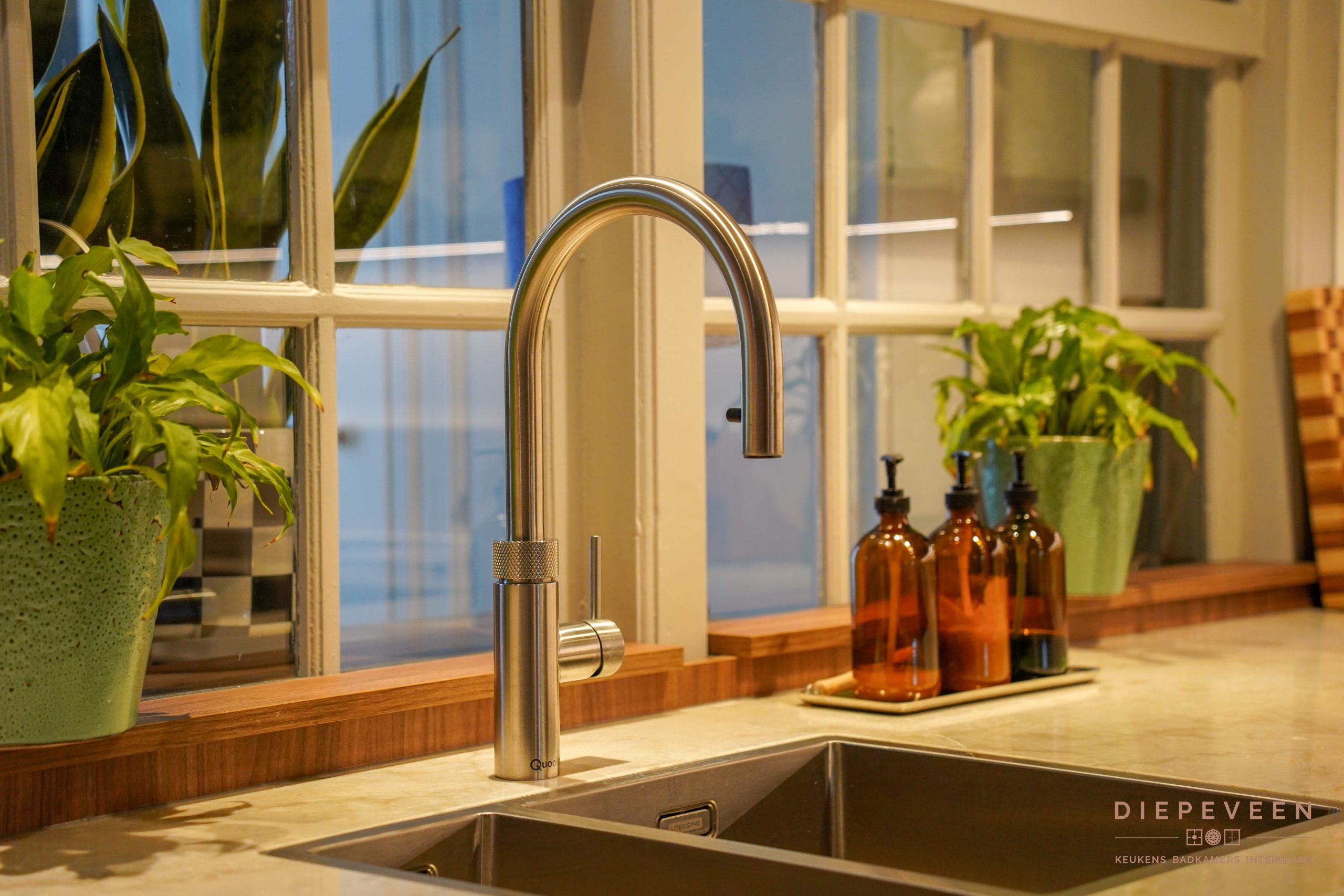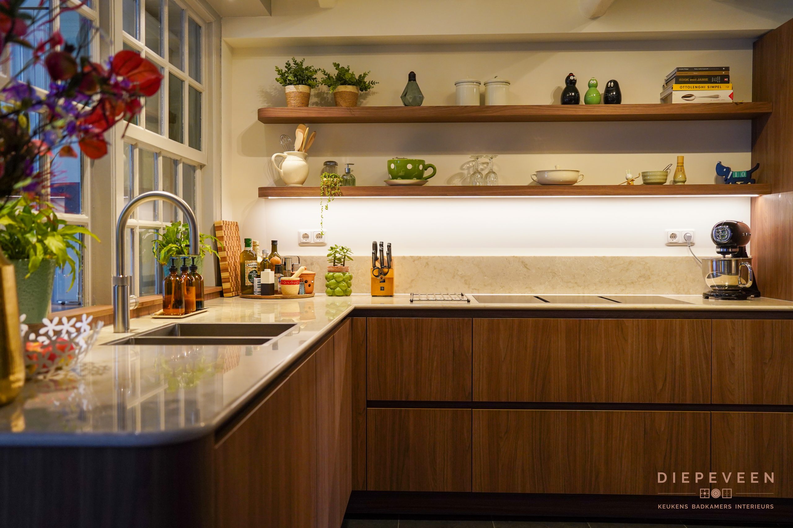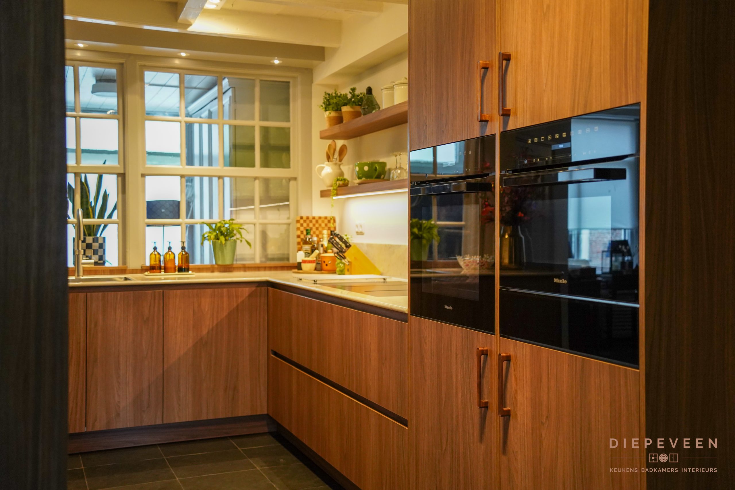Een warme en sfeervolle keuken staat hier in Zaltbommel, prachtig uitgevoerd met ronde elementen. Helemaal in de trend van nu, de warme houten fronten ademen direct warmte en in combinatie met het prachtige werkblad matcht het perfect in deze stijl. Een populair werkblad, en dat snappen wij wel, het composieten blad in de kleur Glencoe is een lust voor het oog! Puur genieten. En oh ja, dit moeten we nog even zeggen: kijk ook naar de prachtige Opera kookplaat met afzuiging. Wij zijn fan, binnenkort namelijk in onze showroom te bewonderen!