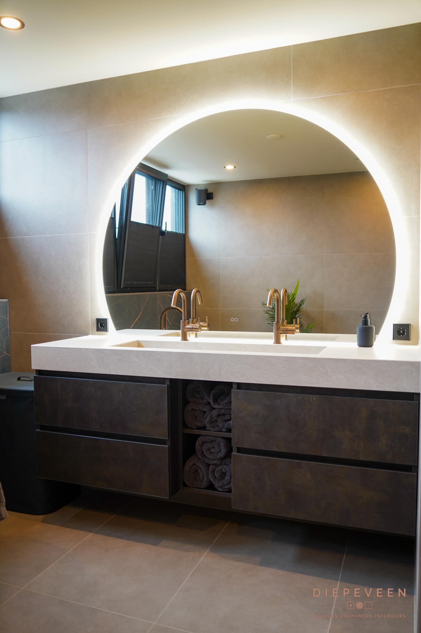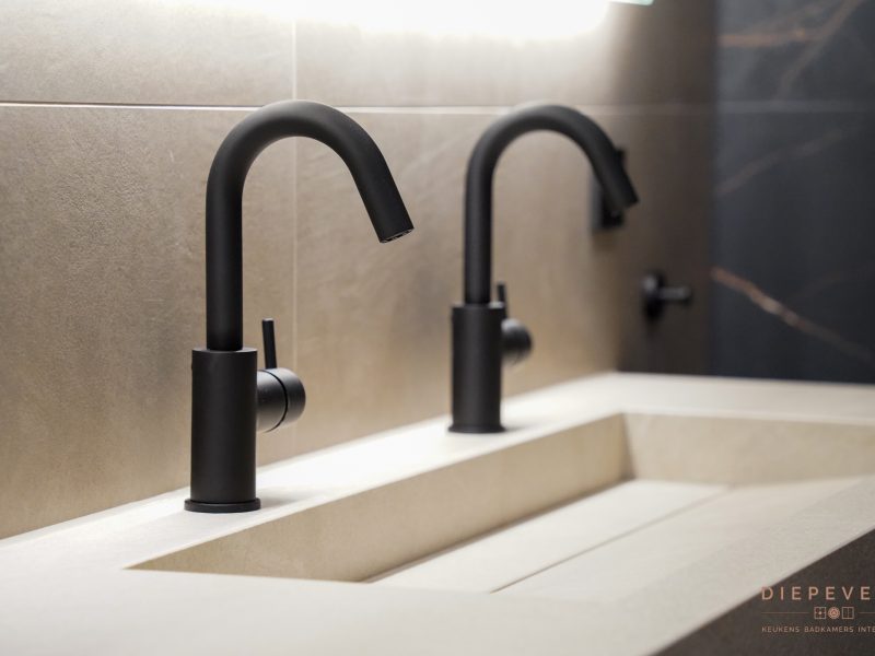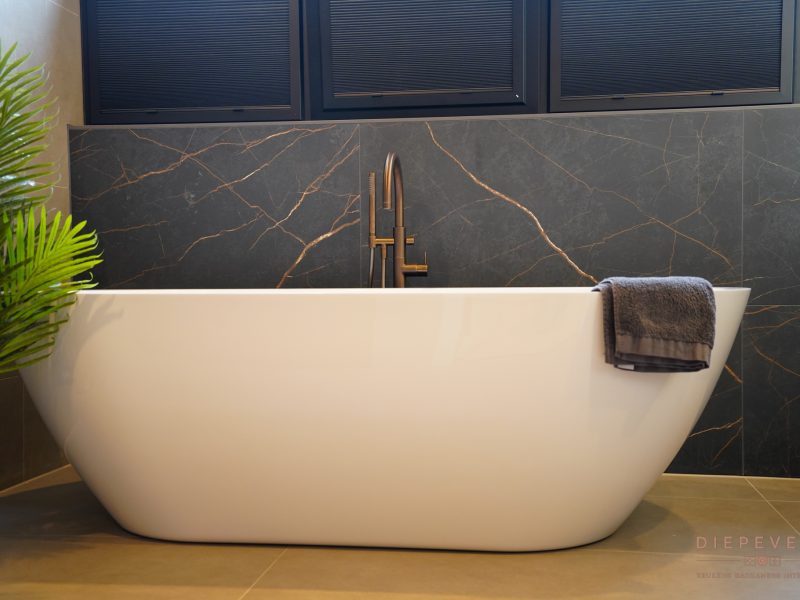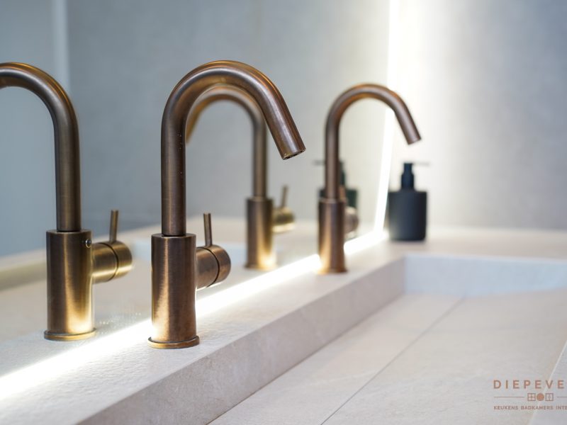 Stap binnen in deze schitterende badkamers, waar luxe en comfort perfect samenkomen. Zwart en brons vormen de basis en zorgen direct voor een warme, chique sfeer die rust uitstraalt.