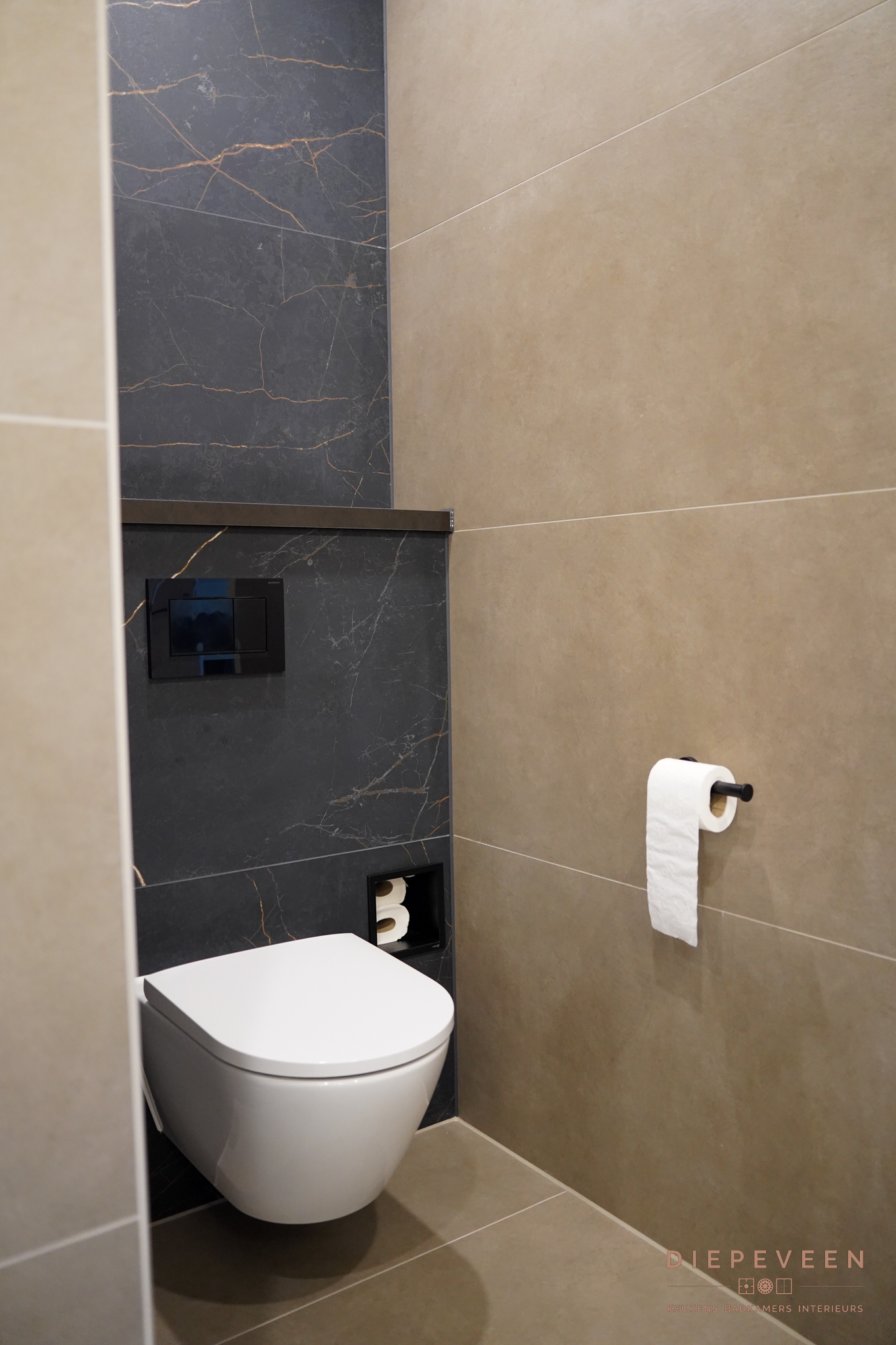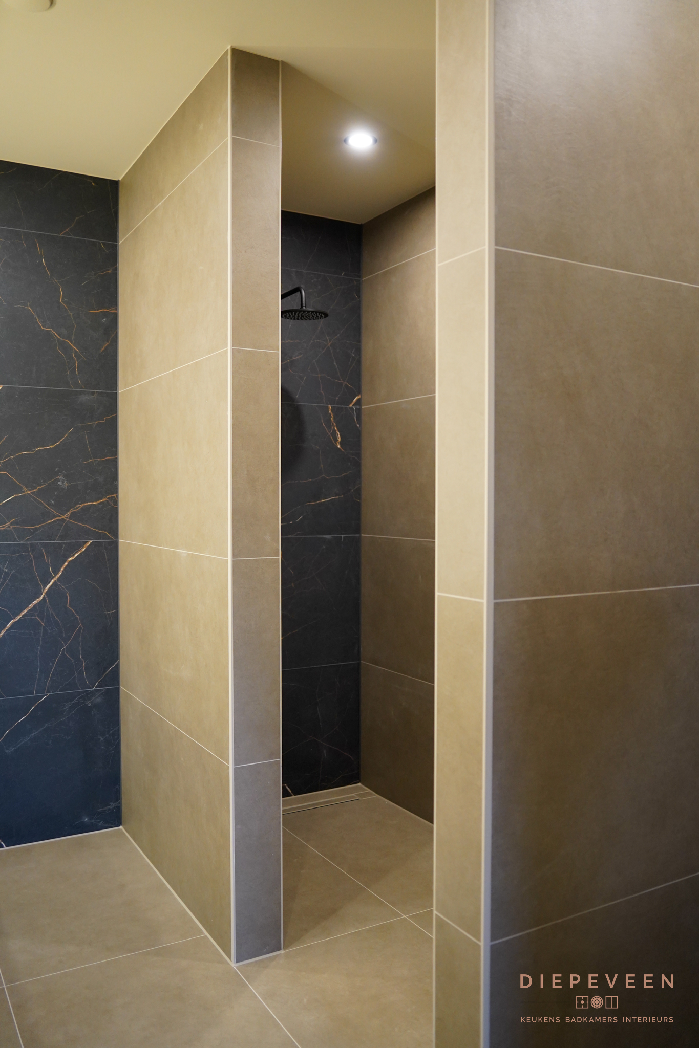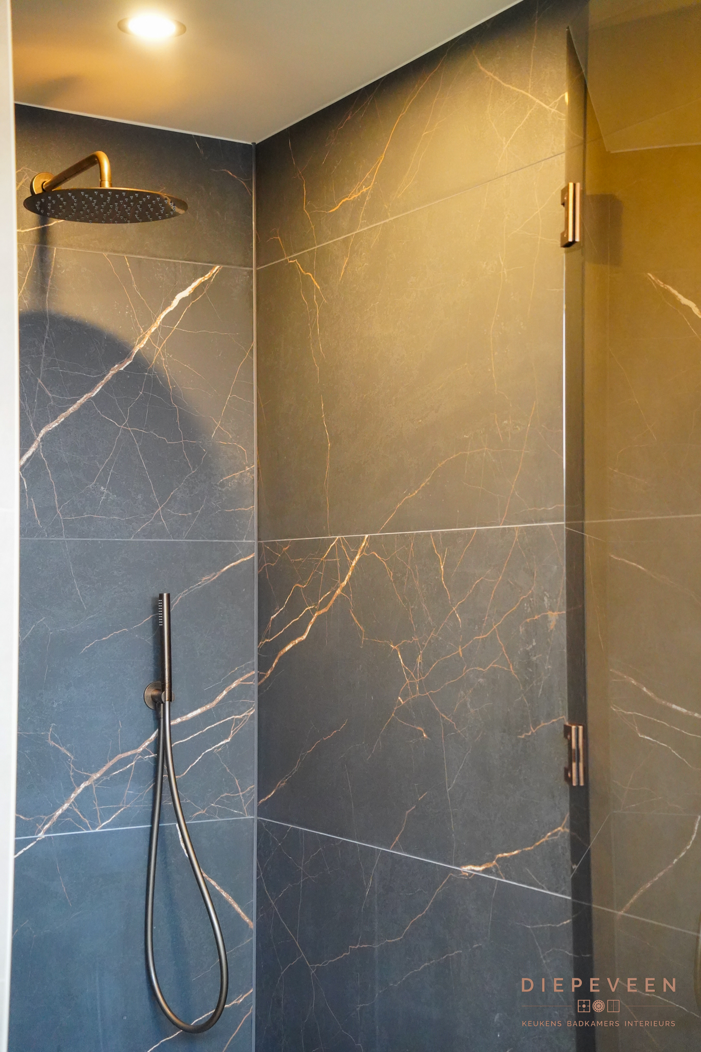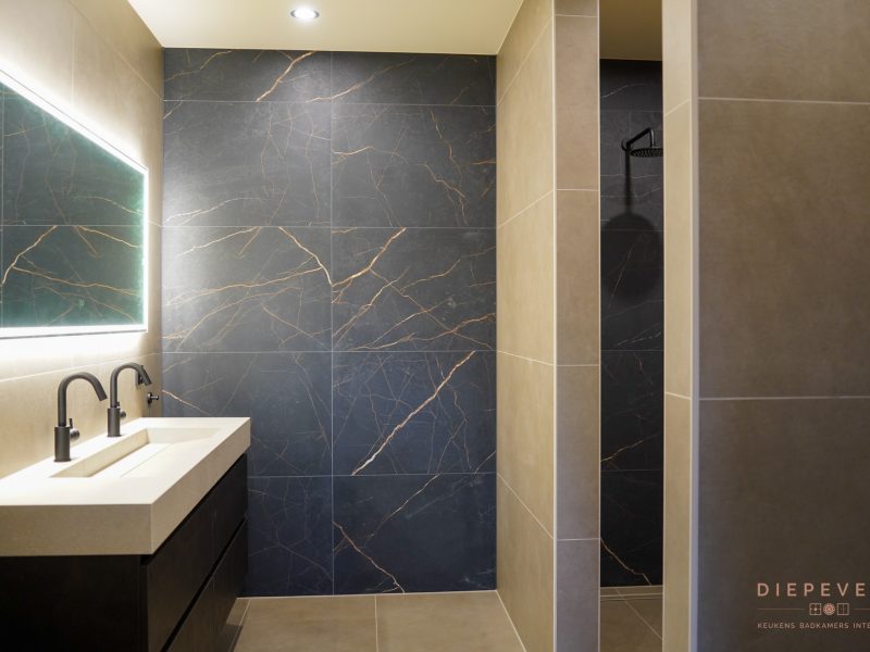 De marmerlook tegels geven de ruimte karakter en diepte. De tekening in het materiaal maakt het geheel levendig, zonder dat het te druk wordt. In combinatie met de donkere tinten en bronzen details ontstaat een badkamer die luxe aanvoelt en prettig is in gebruik.