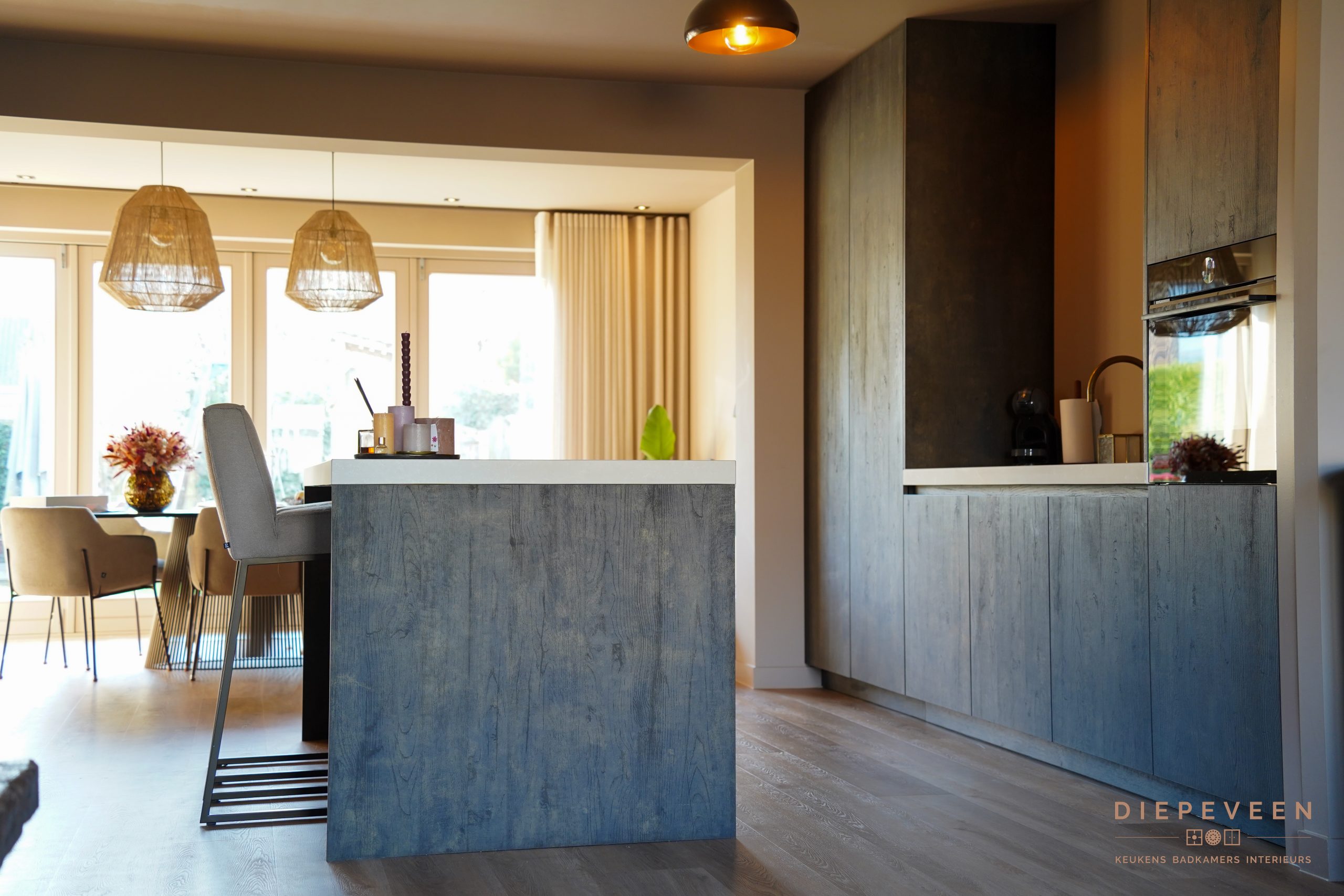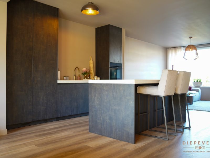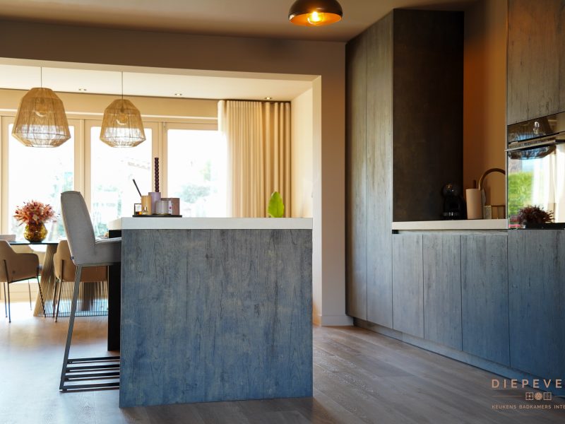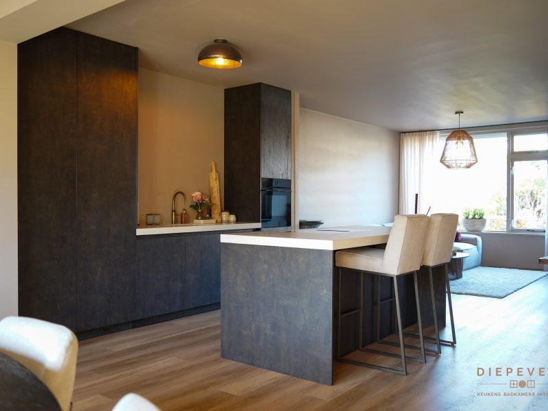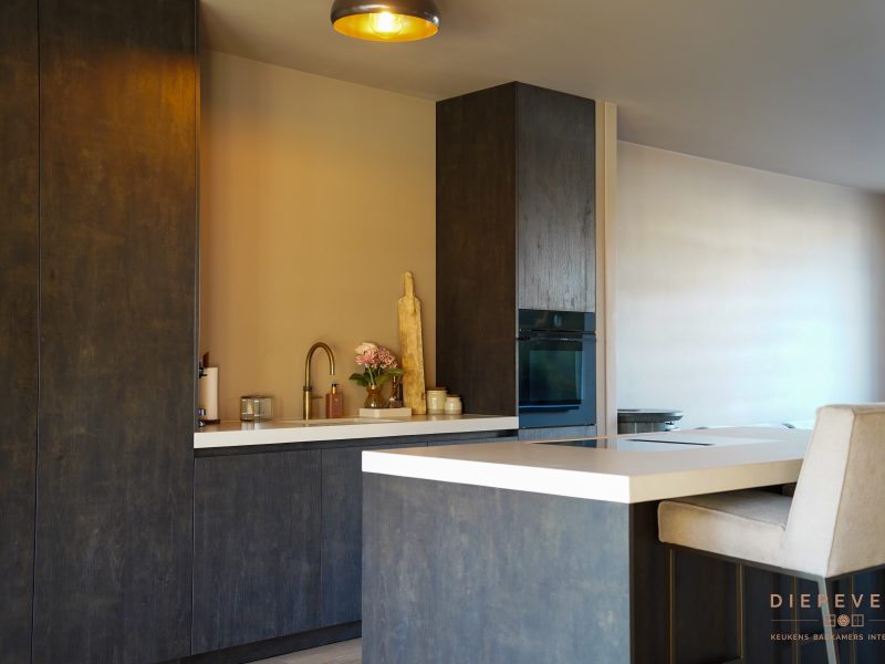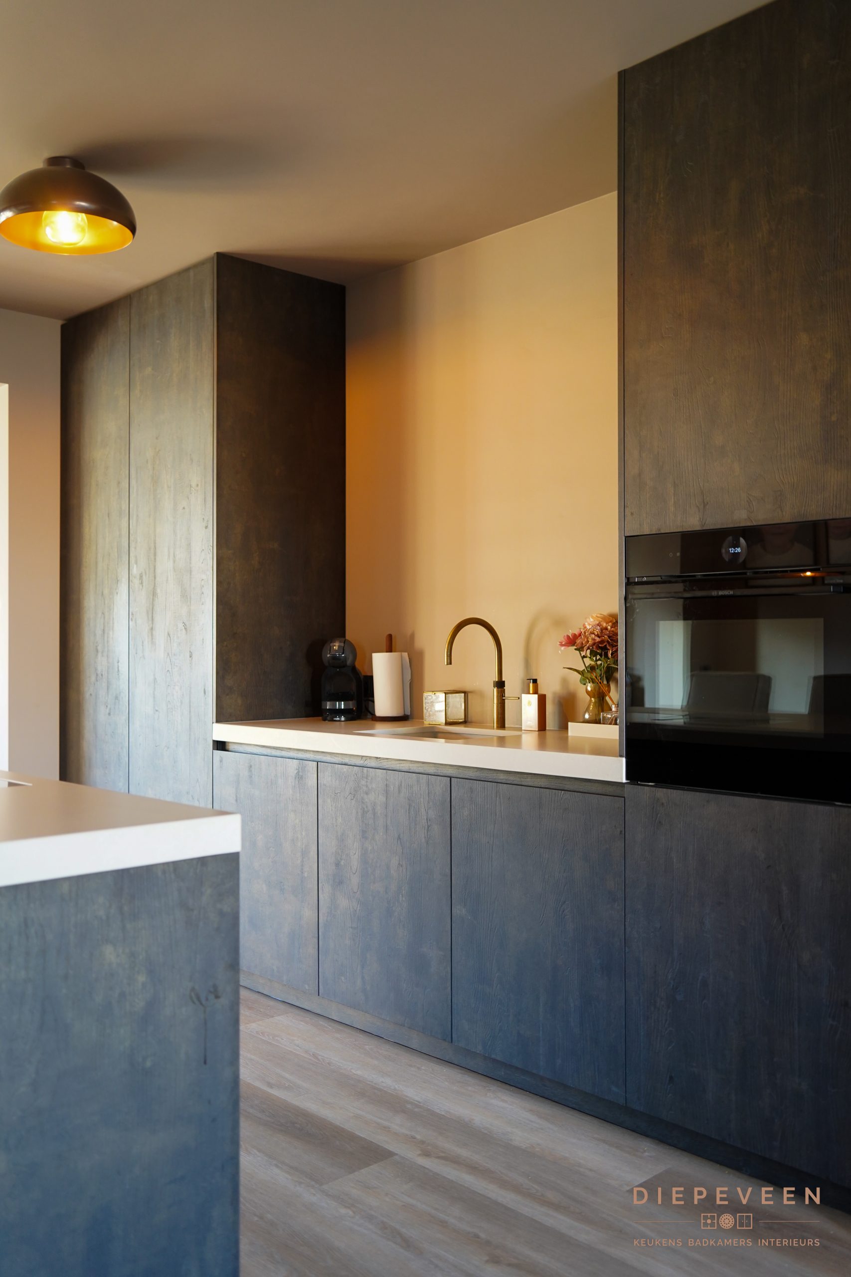 Deze keuken heeft die ontspannen luxe waar je meteen op afgaat! Het donkere hout brengt sfeer. Het lichte natuurstenen werkblad houdt het ontwerp mooi in balans. Daardoor voelt het eiland als de plek waar je automatisch naartoe loopt. Het nodigt uit zonder moeite te doen. Juist die combinatie maakt deze keuken zo gemaakt om in te leven!