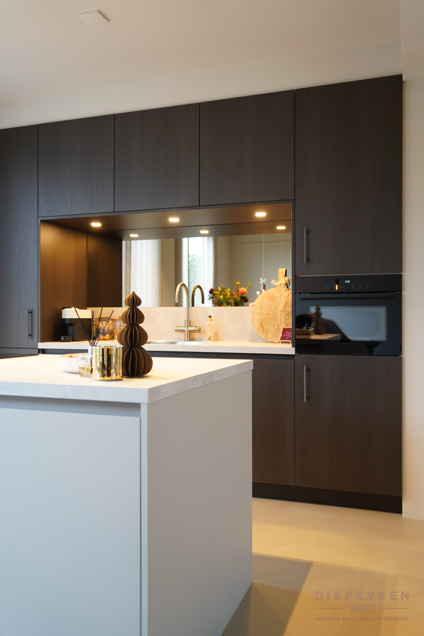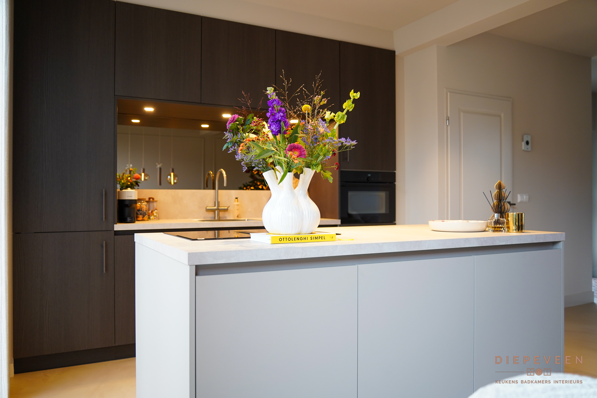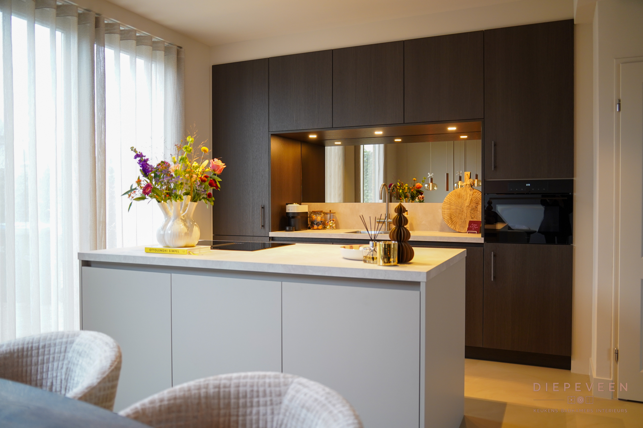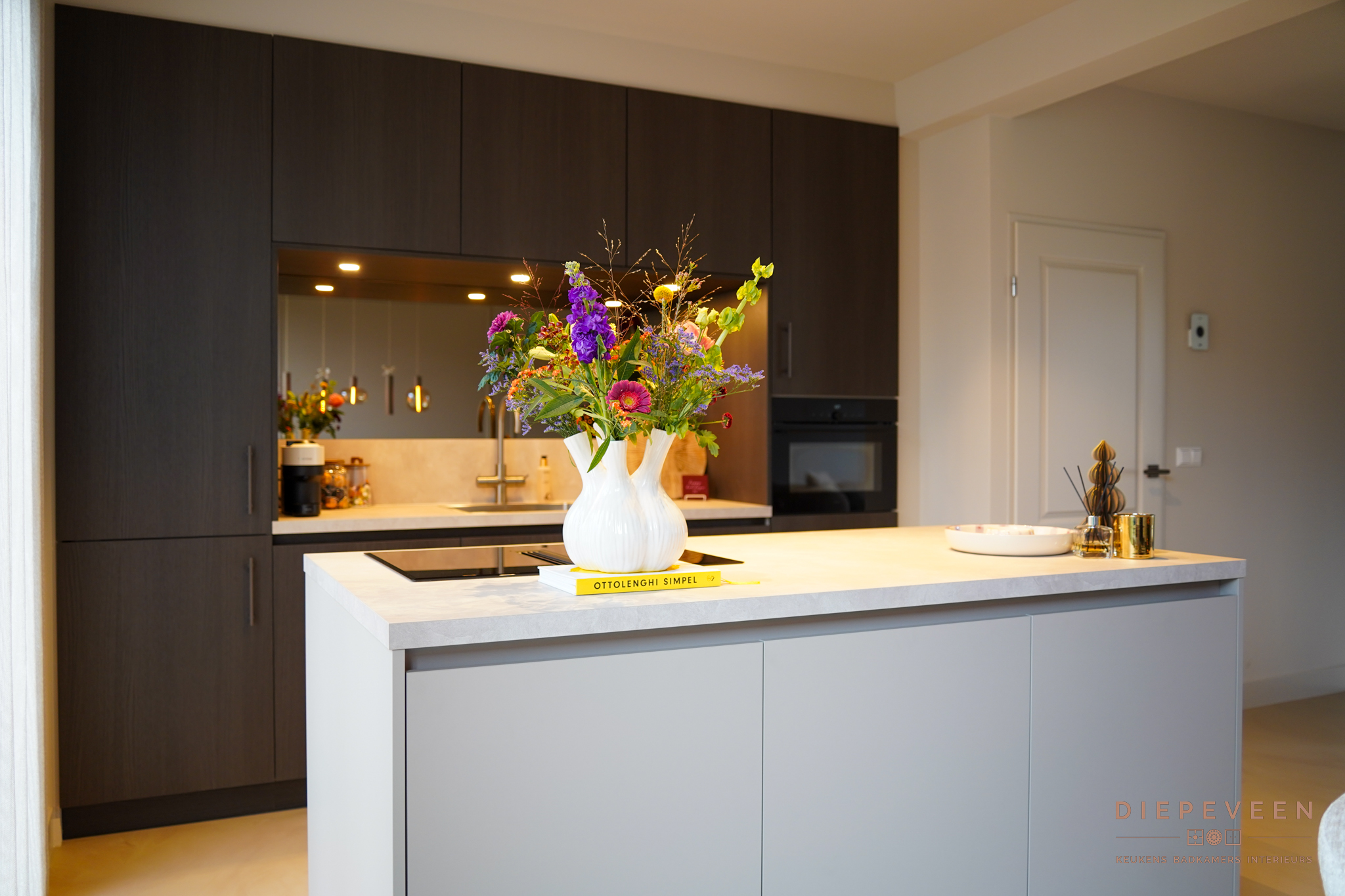 Wat een heerlijk aanzicht deze keuken, een keuken die van alle gemakken is voorzien! Een ruime en strakke kastenwand die met prachtig maatwerk is afgewerkt en die mooi doorloopt bovenin. En het lichte eiland past toch perfect erbij?! Lekker fris, elegant en stijlvol. De kookplaat met afzuiging en de oven zorgen voor heerlijk kookgemak. Bedankt voor het vertrouwen in Diepeveen, een mooie opdracht met een droomkeuken als eindresultaat!