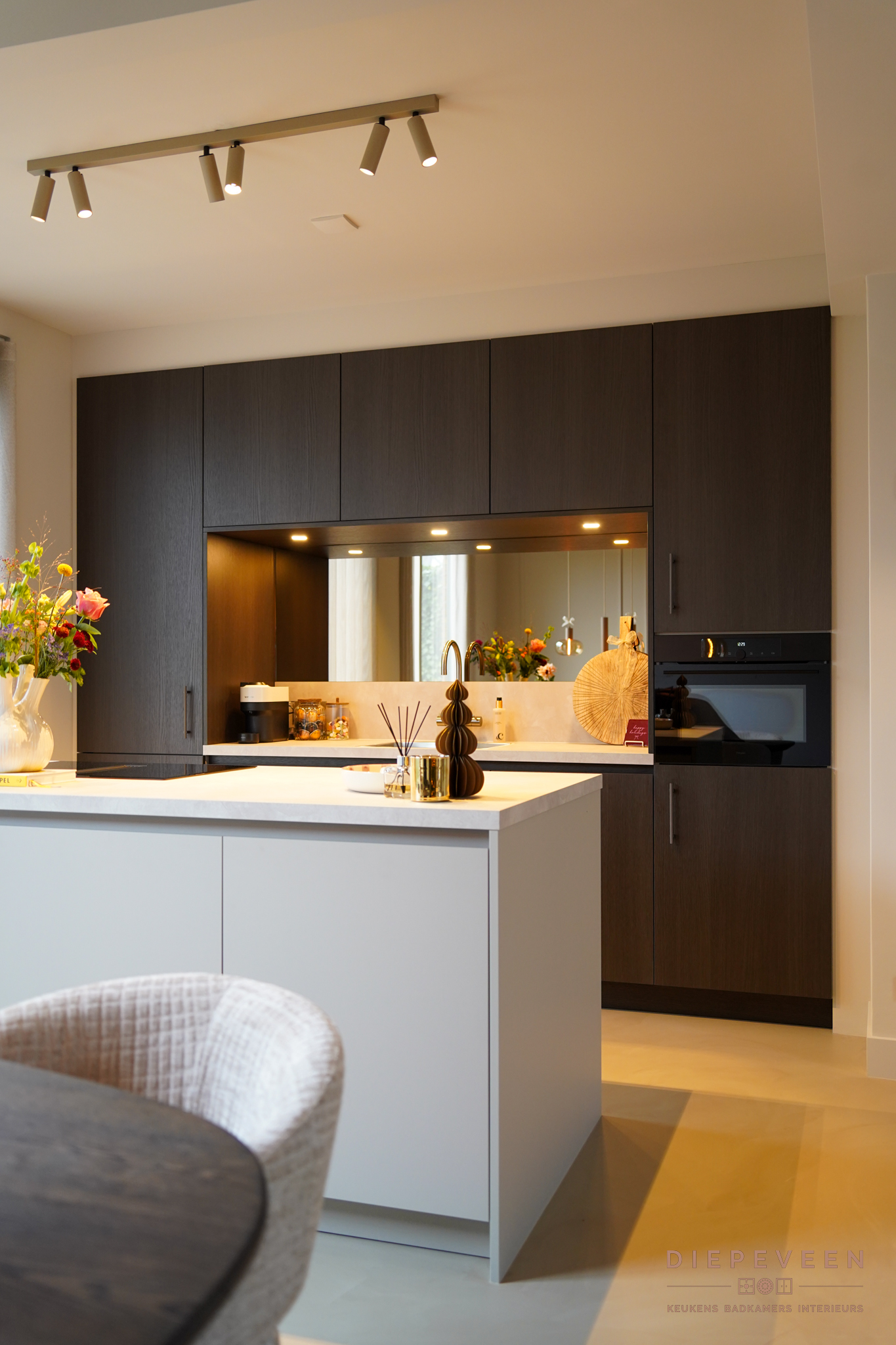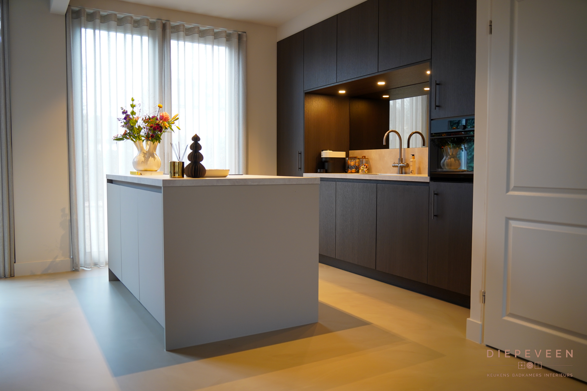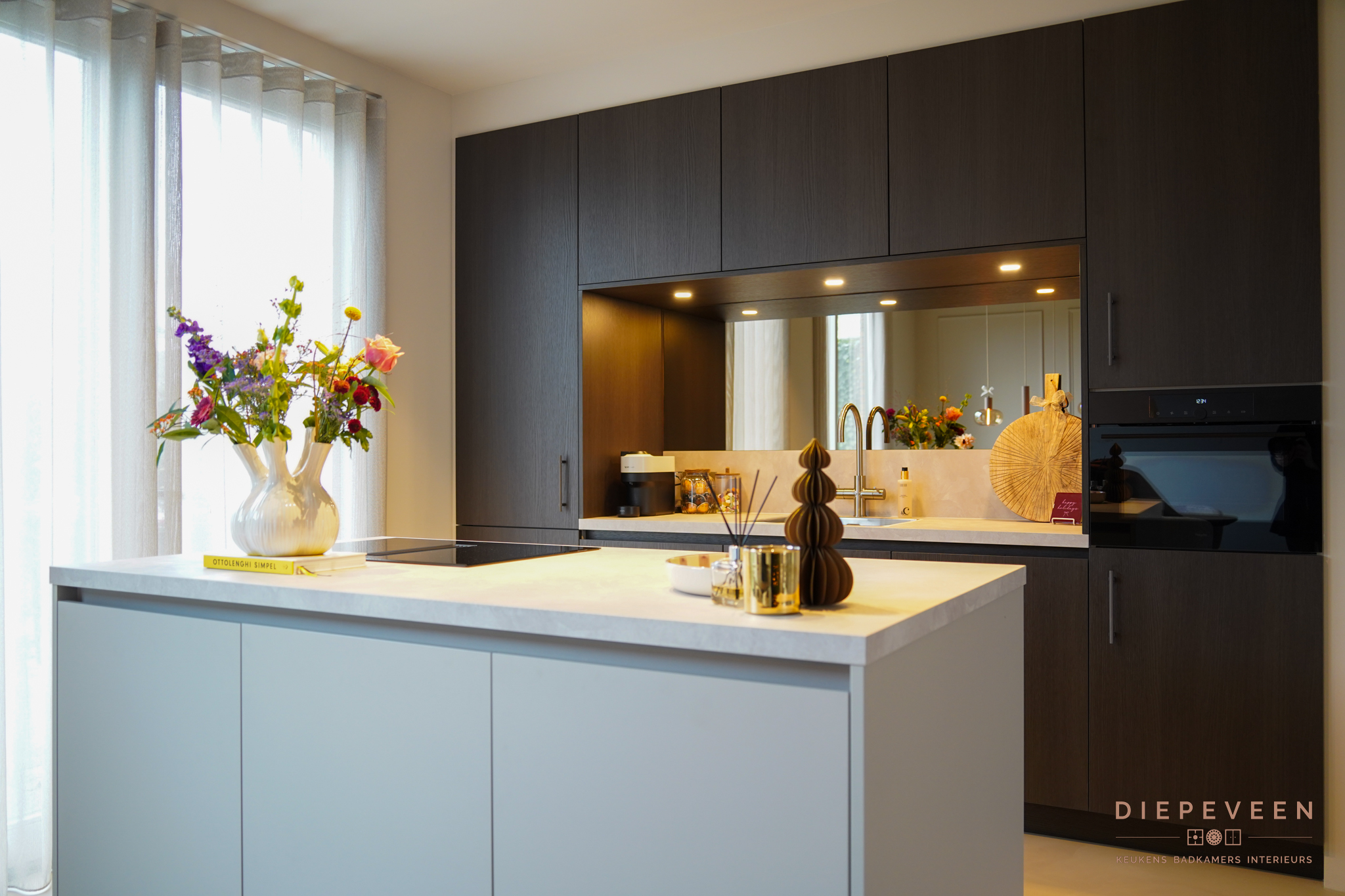 Wat een heerlijk aanzicht deze keuken, een keuken die van alle gemakken is voorzien! Een ruime en strakke kastenwand die met prachtig maatwerk is afgewerkt en die mooi doorloopt bovenin. En het lichte eiland past toch perfect erbij?! Lekker fris, elegant en stijlvol. De kookplaat met afzuiging en de oven zorgen voor heerlijk kookgemak. Bedankt voor het vertrouwen in Diepeveen, een mooie opdracht met een droomkeuken als eindresultaat!