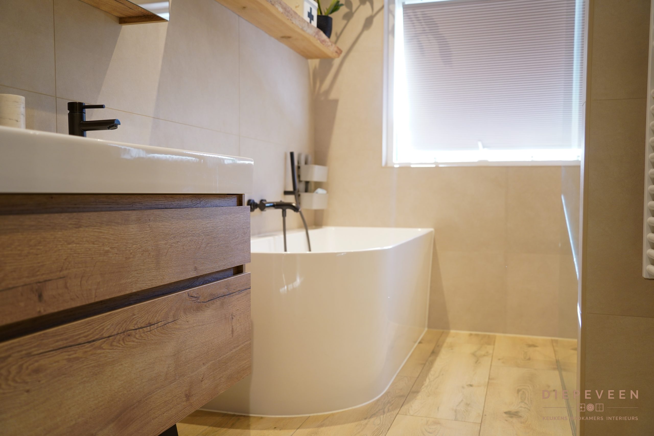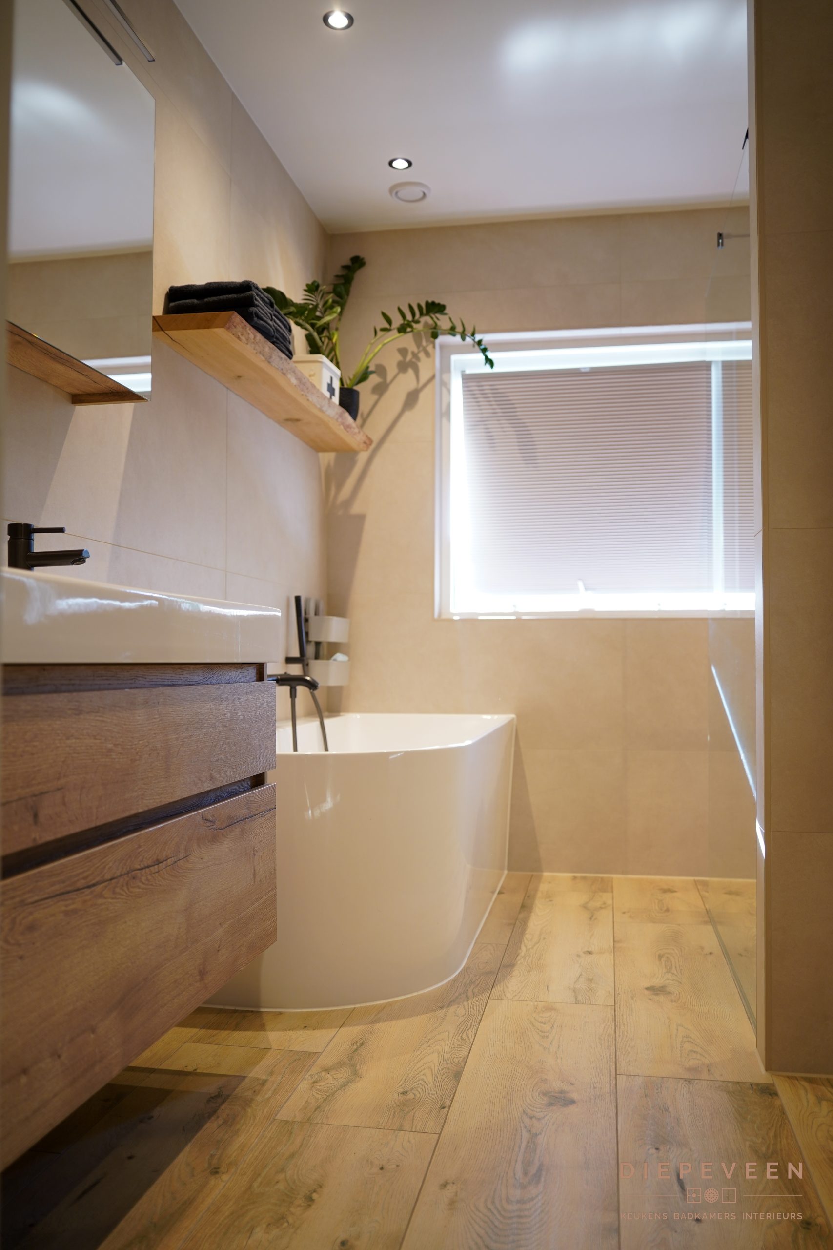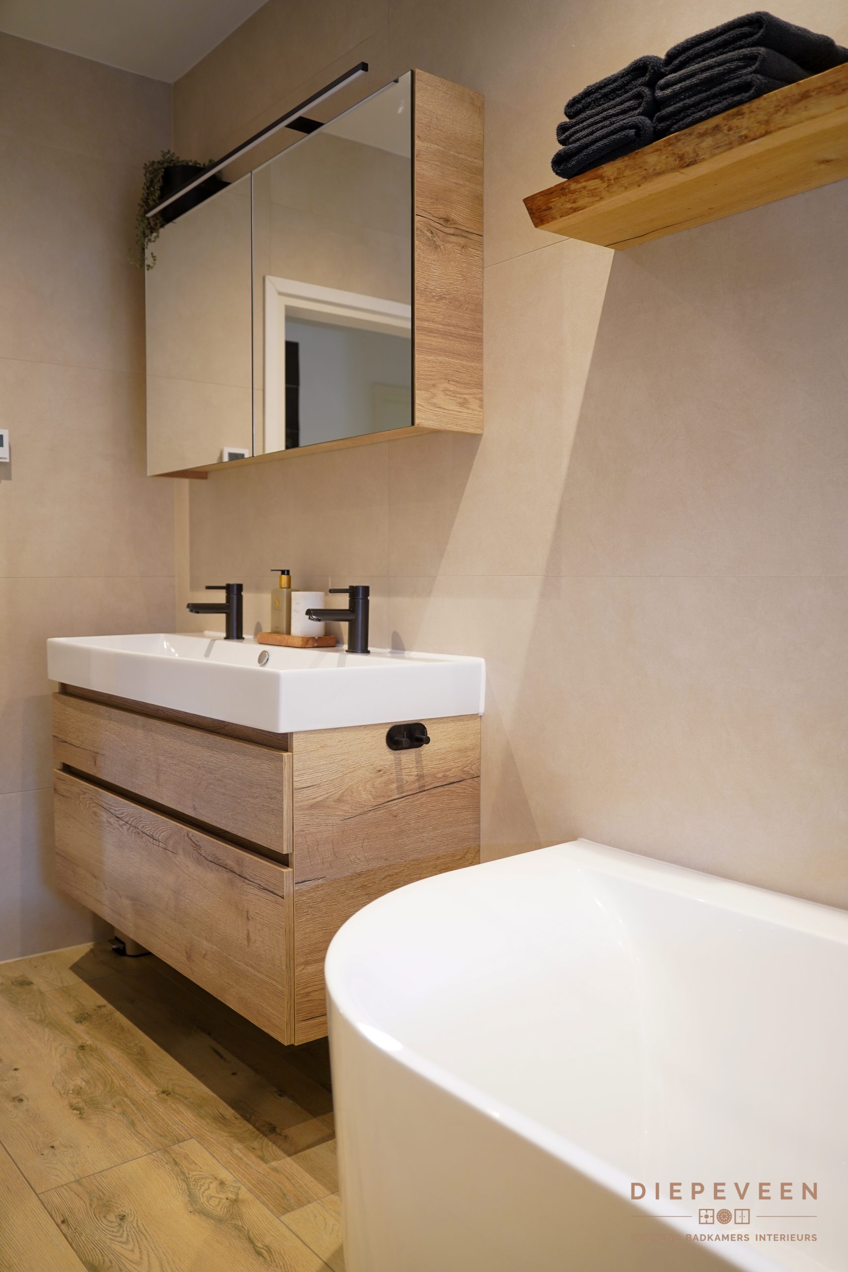 Zodra je deze badkamer binnenstapt, valt de rust op. Zachte tinten en warm hout zorgen samen voor een tijdloze en sfeervolle uitstraling.