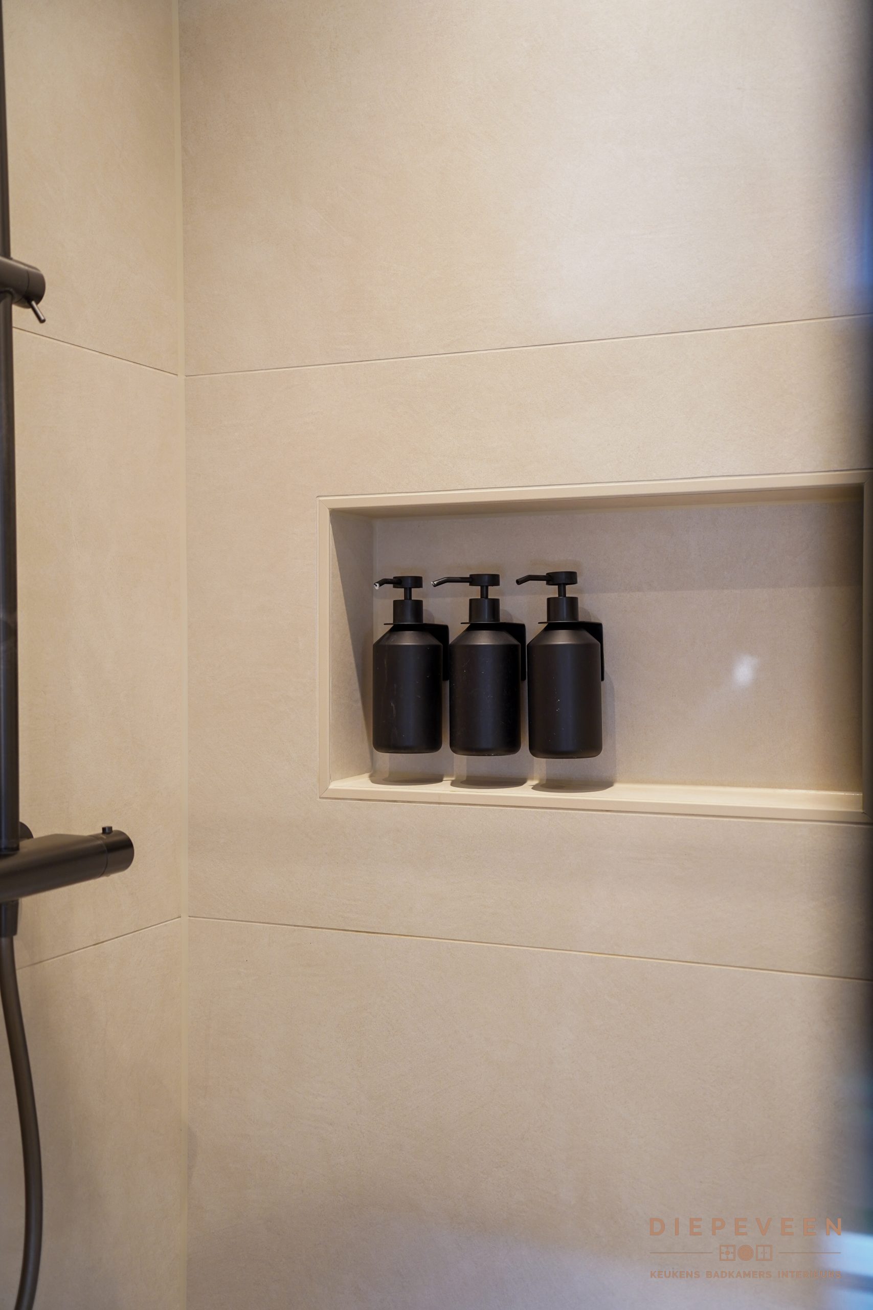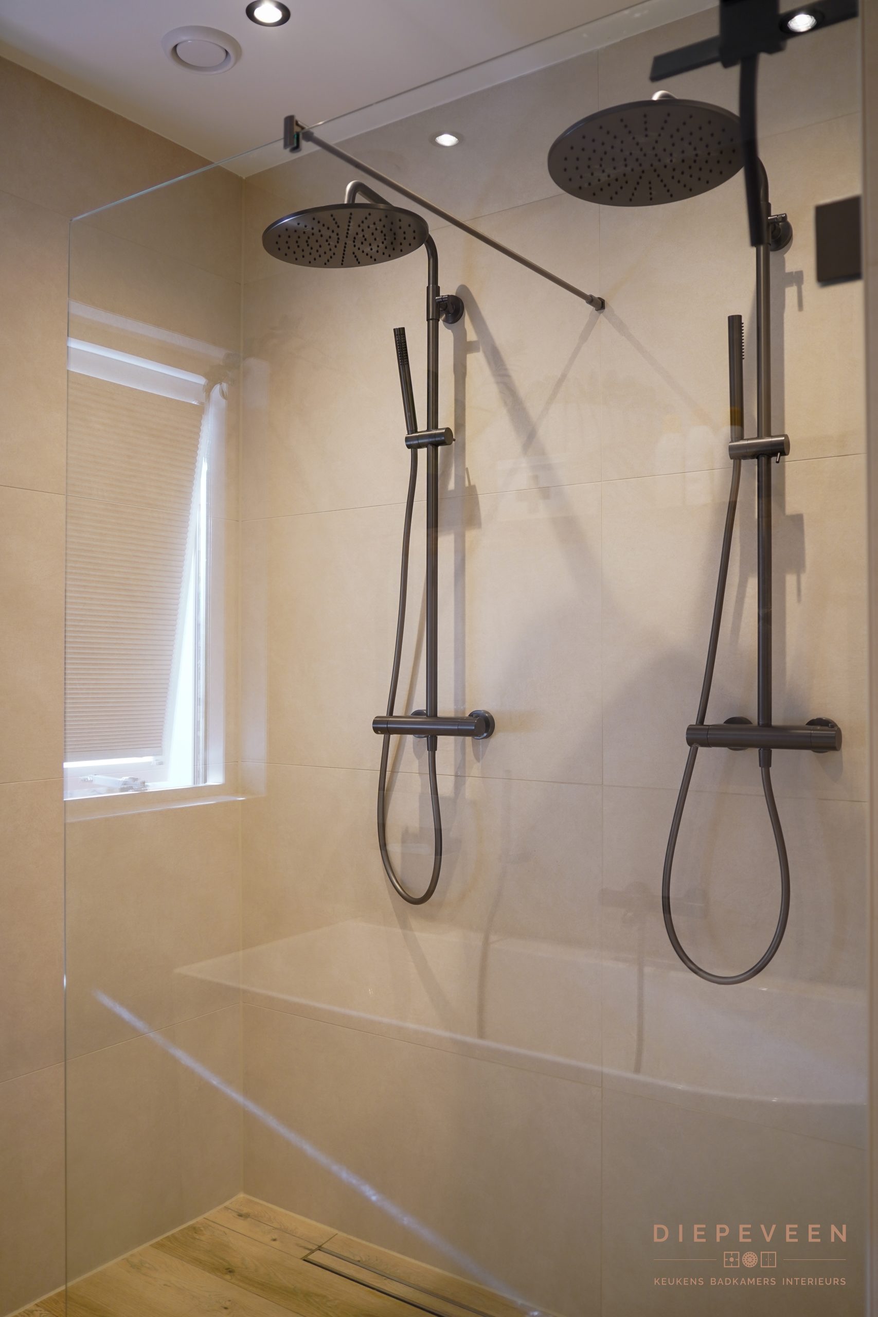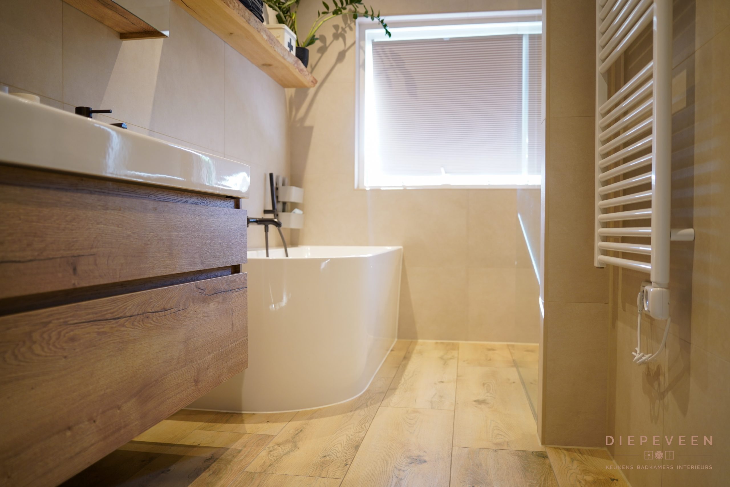 Zodra je deze badkamer binnenstapt, valt de rust op. Zachte tinten en warm hout zorgen samen voor een tijdloze en sfeervolle uitstraling.