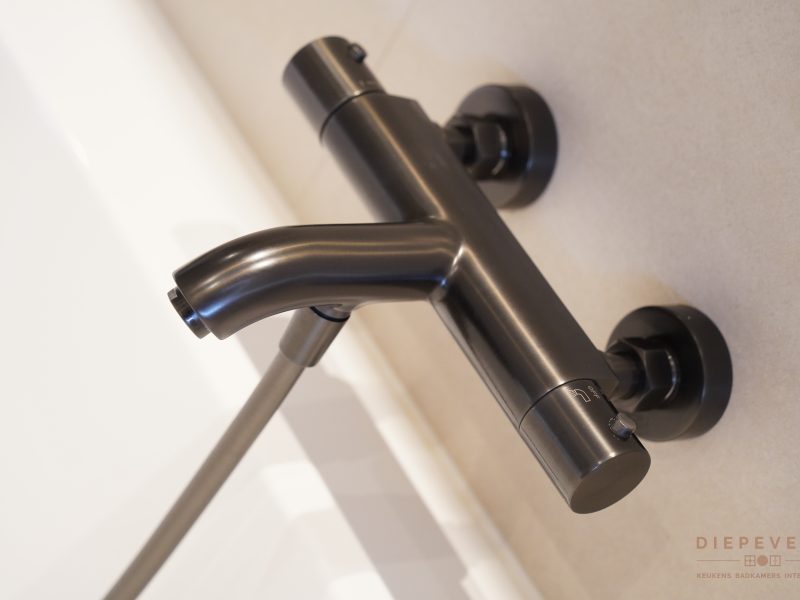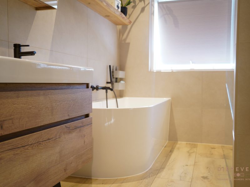 De royale inloopdouche en het vrijstaande bad maken van deze ruimte een fijne plek om te ontspannen. Materialen en details sluiten mooi op elkaar aan, waardoor de badkamer warm aanvoelt en uitnodigt om hier elke dag opnieuw van te genieten nu én over jaren.