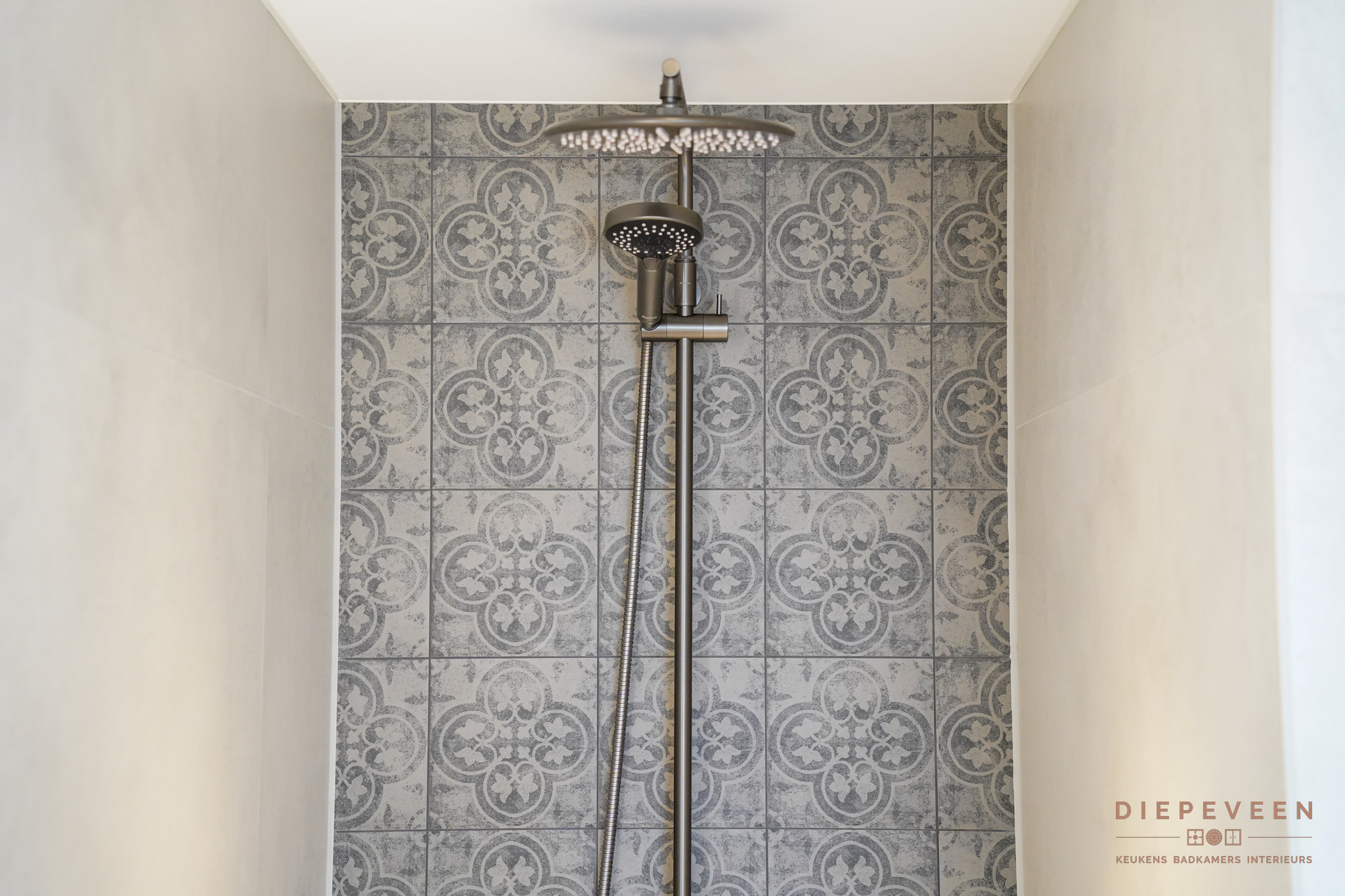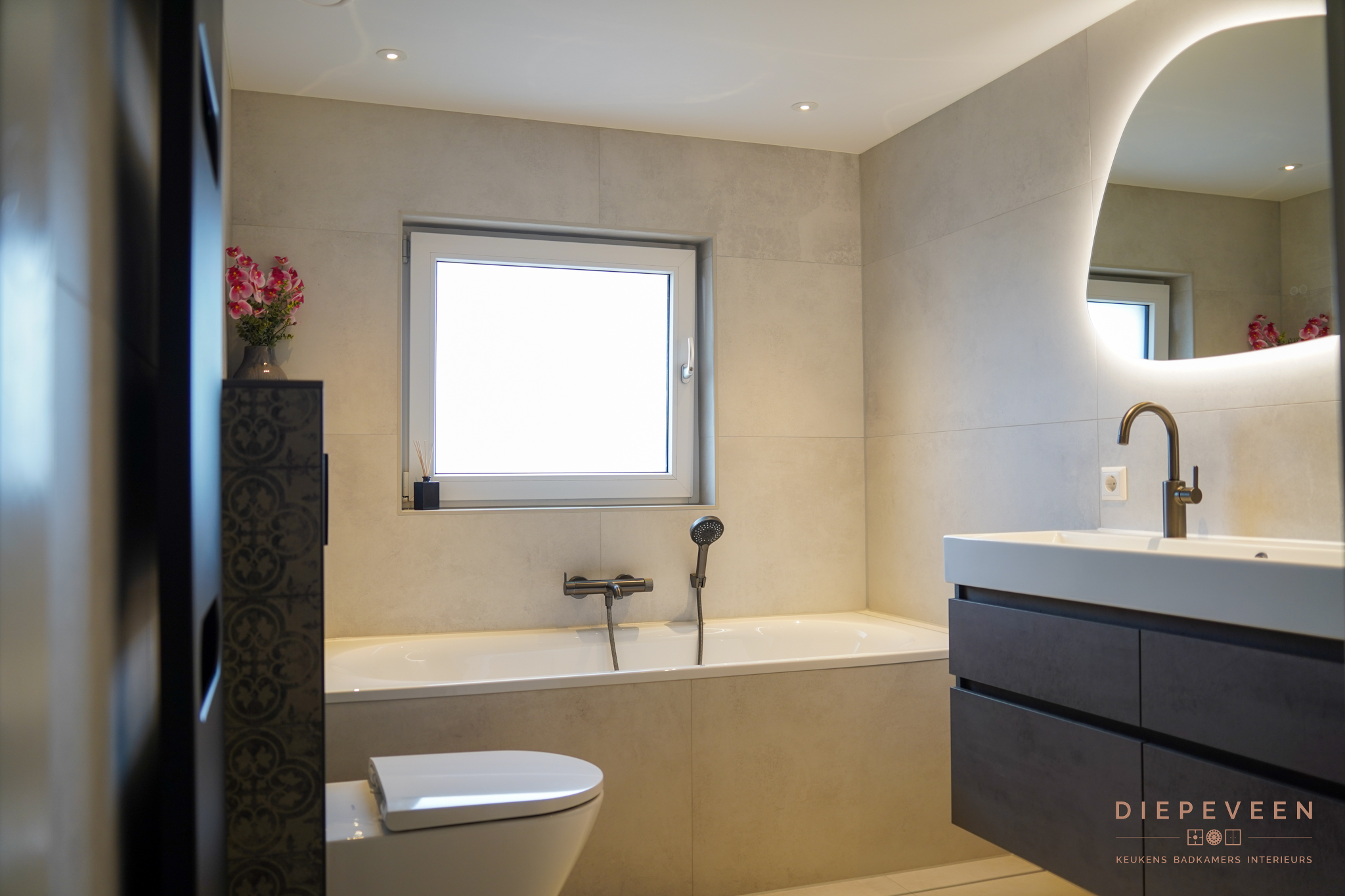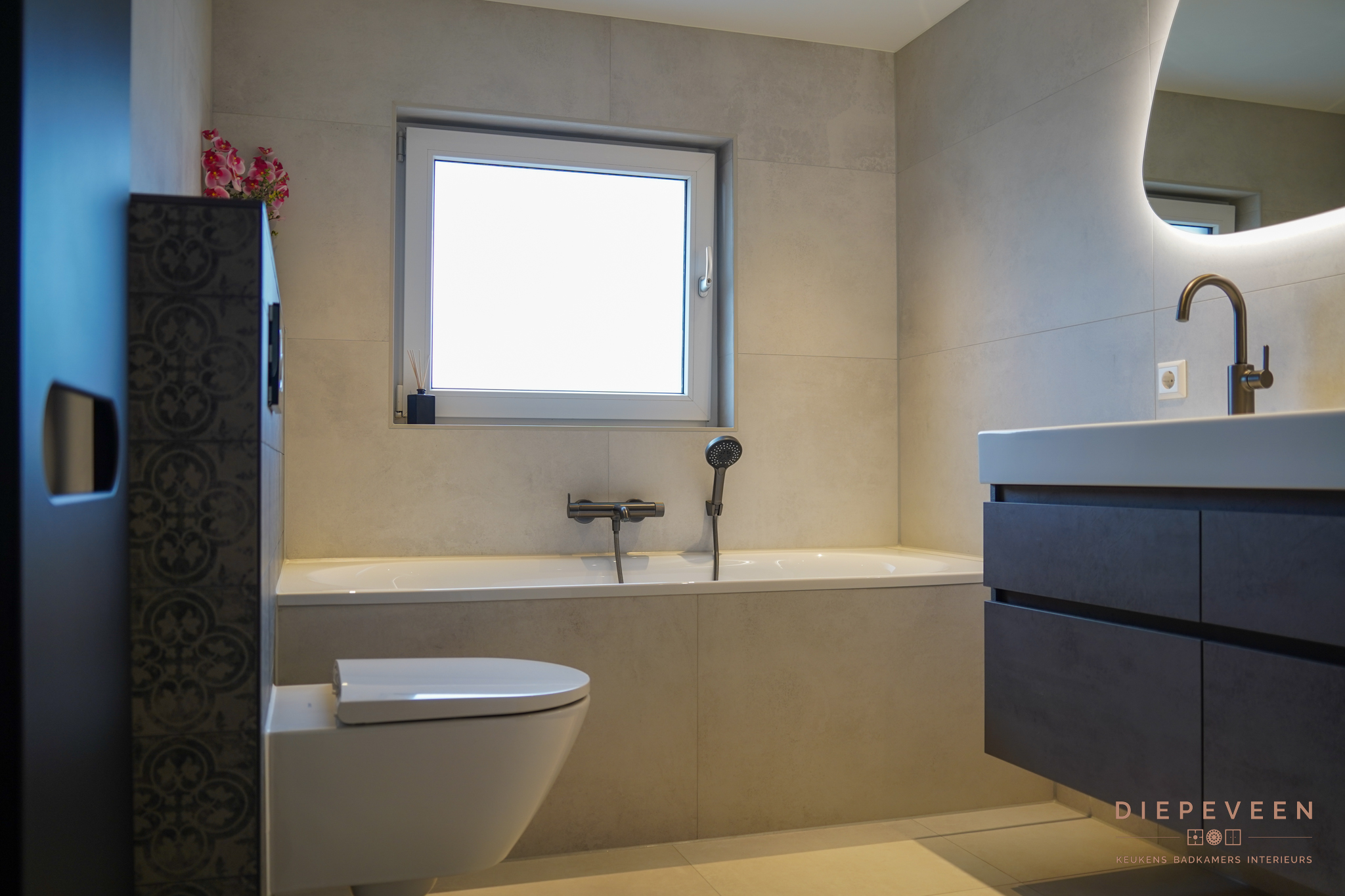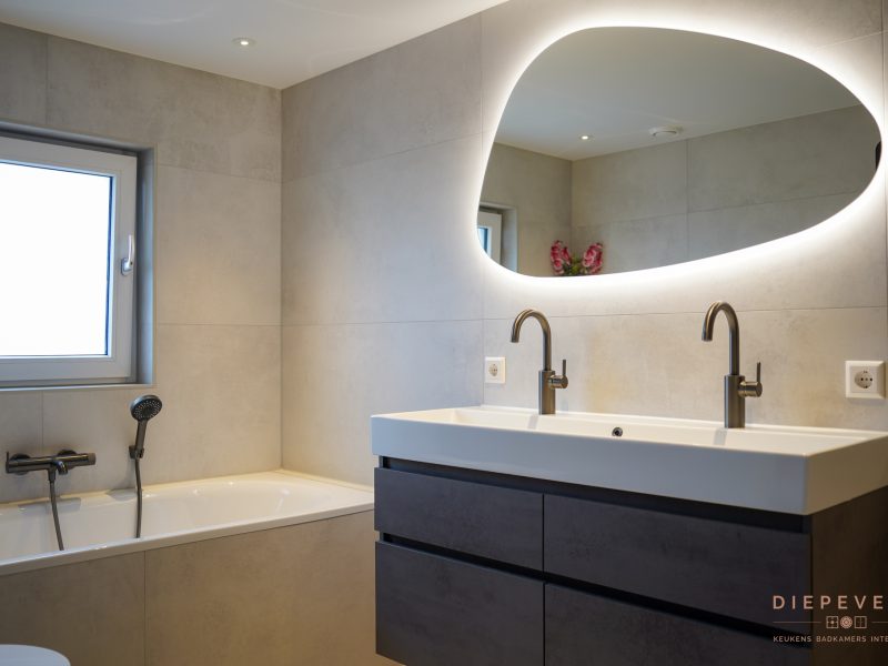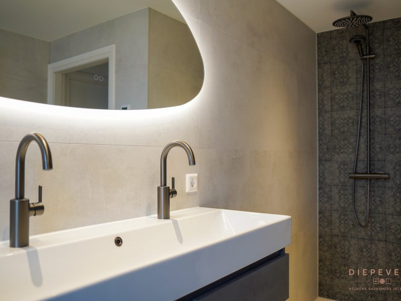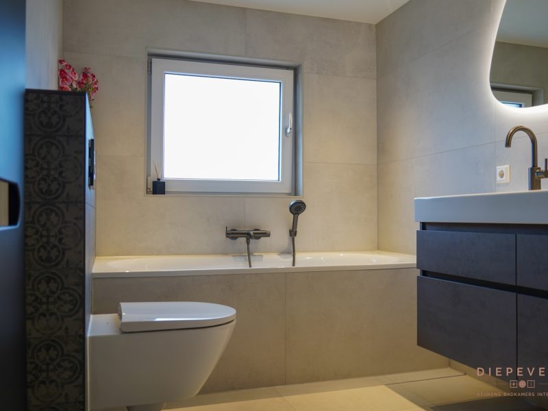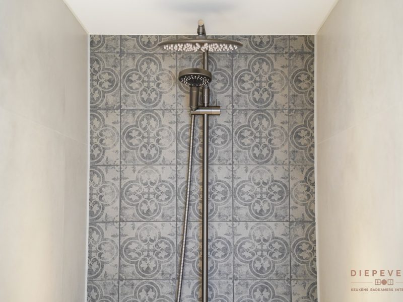 Je bevindt je in deze badkamer in een oase van rust. Dezelfde tegel is toegepast op zowel vloer als wanden, wat zorgt voor een krachtig en rustig geheel. Het ingebouwde bad loopt hier naadloos in door: ook daar zie je de tegel terug, waardoor het bad onderdeel wordt van het ontwerp. In de douche en achter het toilet zorgen uitgesproken tegels voor een bijzonder detail. Ze geven de ruimte karakter en maken deze badkamer uniek en eigentijds, zonder de rust te verstoren. Elk detail draagt bij aan de sfeer. Een badkamer met karakter, waarin je elke dag opnieuw wilt genieten.
