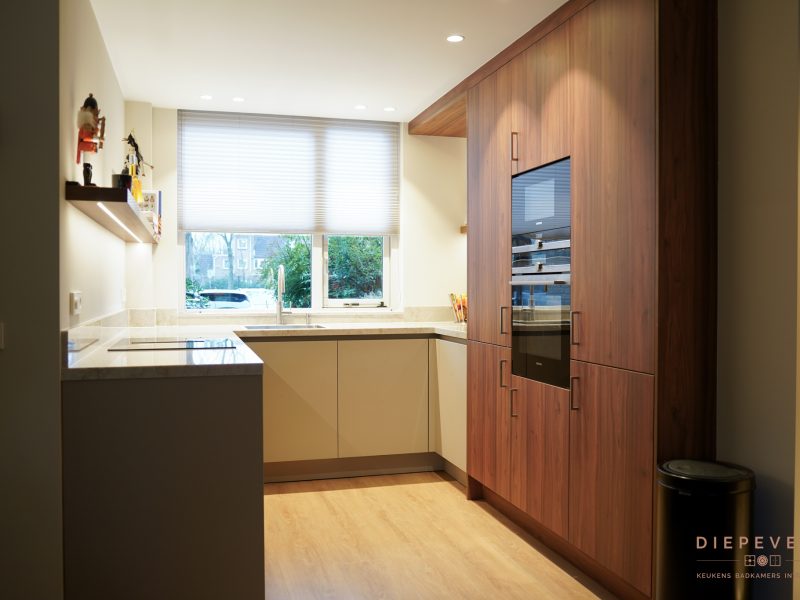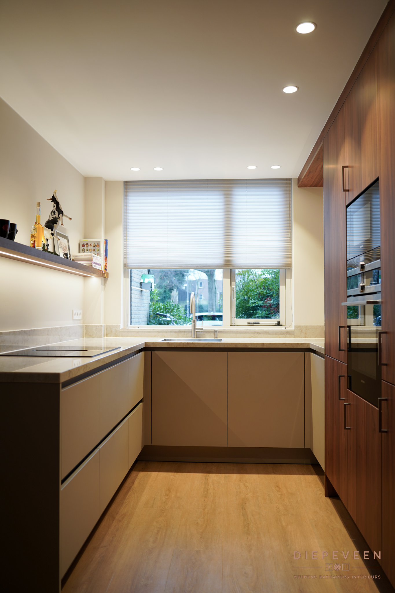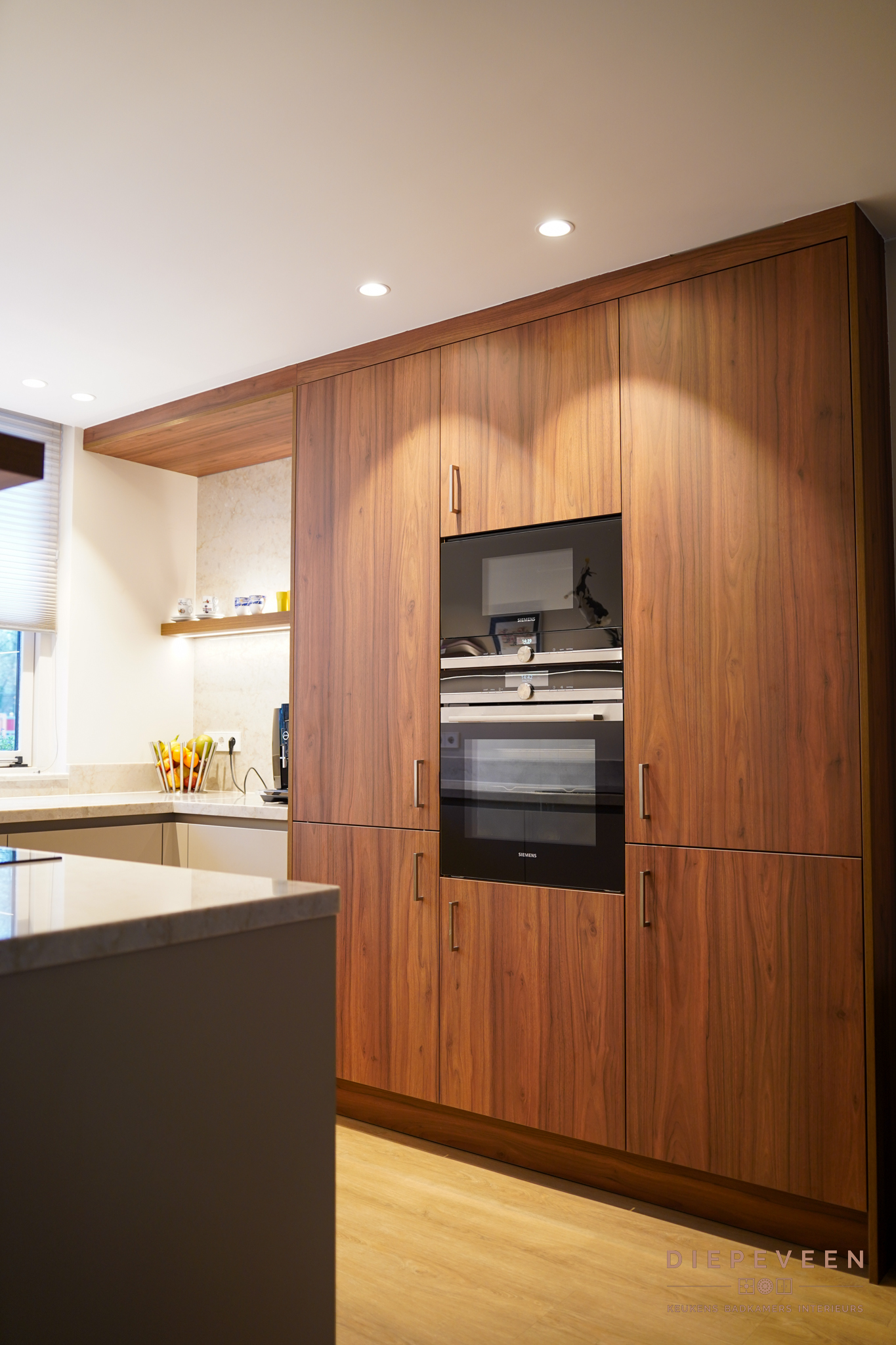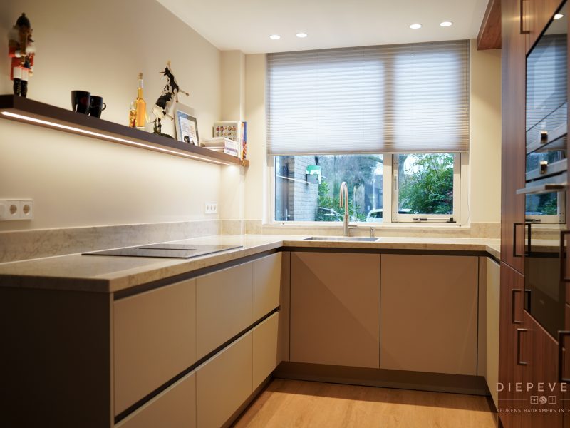 Wat een stralend plaatje, deze U-keuken in Rotterdam! Een warme basis in Terra Grey, gecombineerd met hoge kasten in een natuurlijke houtlook die meteen sfeer brengen. Het lichte composiet werkblad in Glencoe zorgt voor een rustige, luxe uitstraling en maakt het geheel helemaal af. De keuze voor apparatuur van Siemens maakt het niet alleen mooi om te zien, maar ook heerlijk om in te werken. En dan die wandplanken… met een prachtige geïntegreerde LED-strip die ’s avonds zorgt voor een warme gloed en nét dat beetje extra luxe.