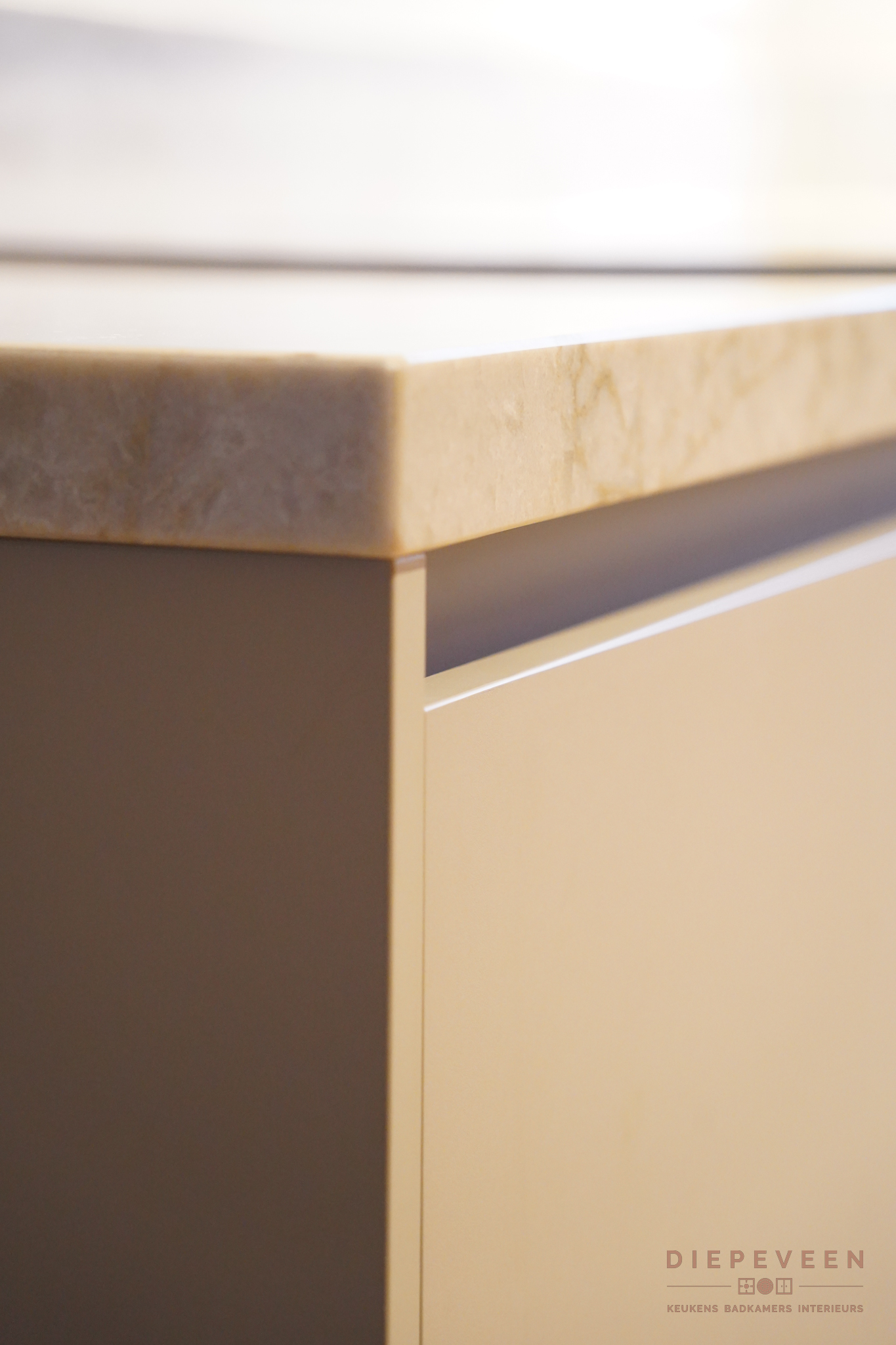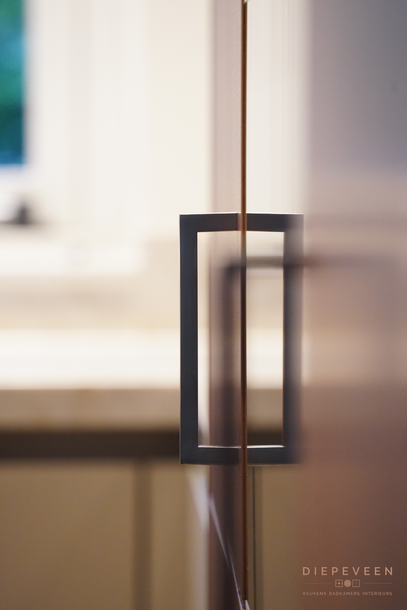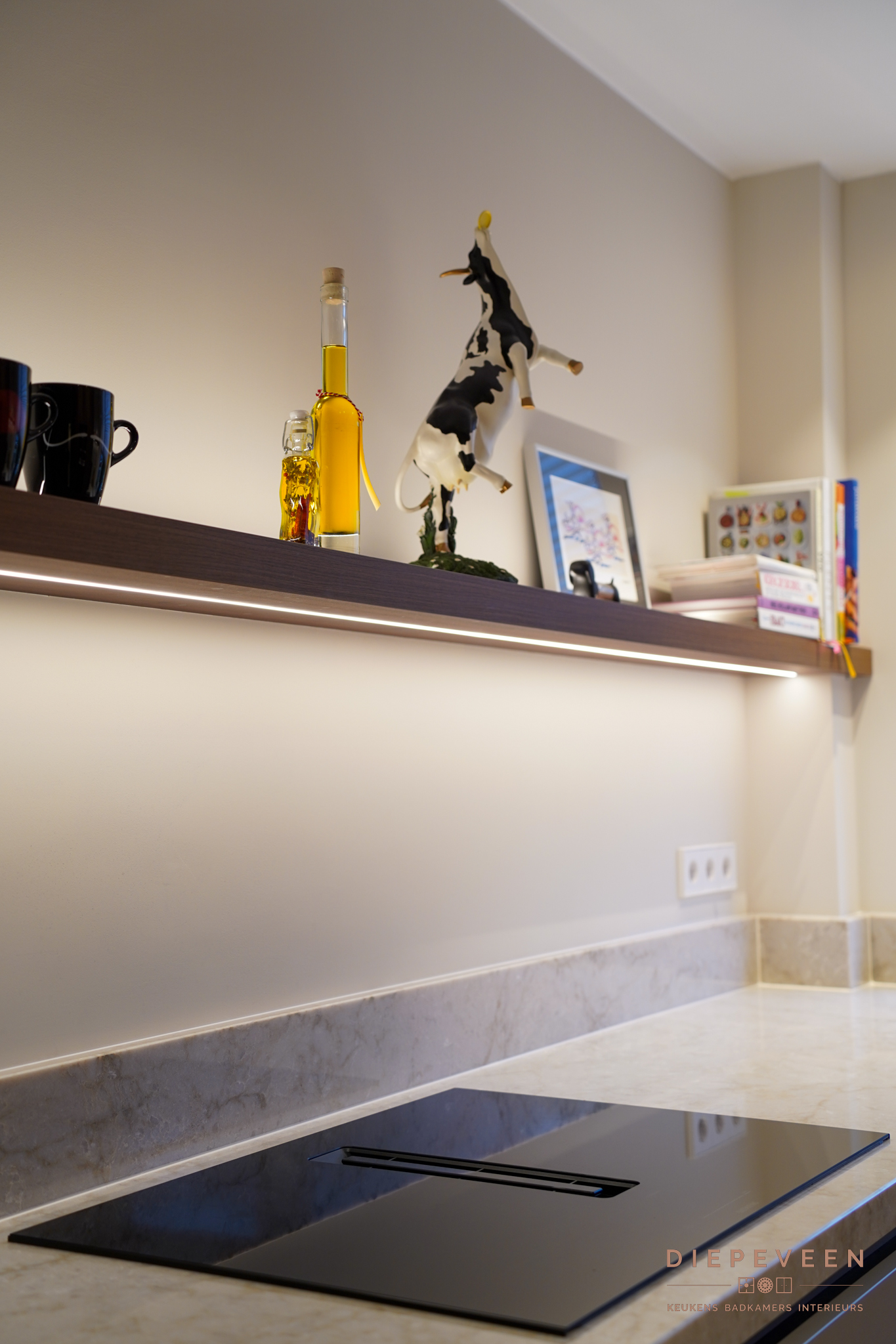Wat een stralend plaatje, deze U-keuken in Rotterdam! Een warme basis in Terra Grey, gecombineerd met hoge kasten in een natuurlijke houtlook die meteen sfeer brengen. Het lichte composiet werkblad in Glencoe zorgt voor een rustige, luxe uitstraling en maakt het geheel helemaal af. De keuze voor apparatuur van Siemens maakt het niet alleen mooi om te zien, maar ook heerlijk om in te werken. En dan die wandplanken… met een prachtige geïntegreerde LED-strip die ’s avonds zorgt voor een warme gloed en nét dat beetje extra luxe.