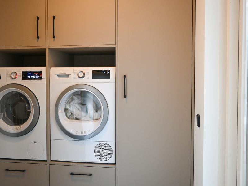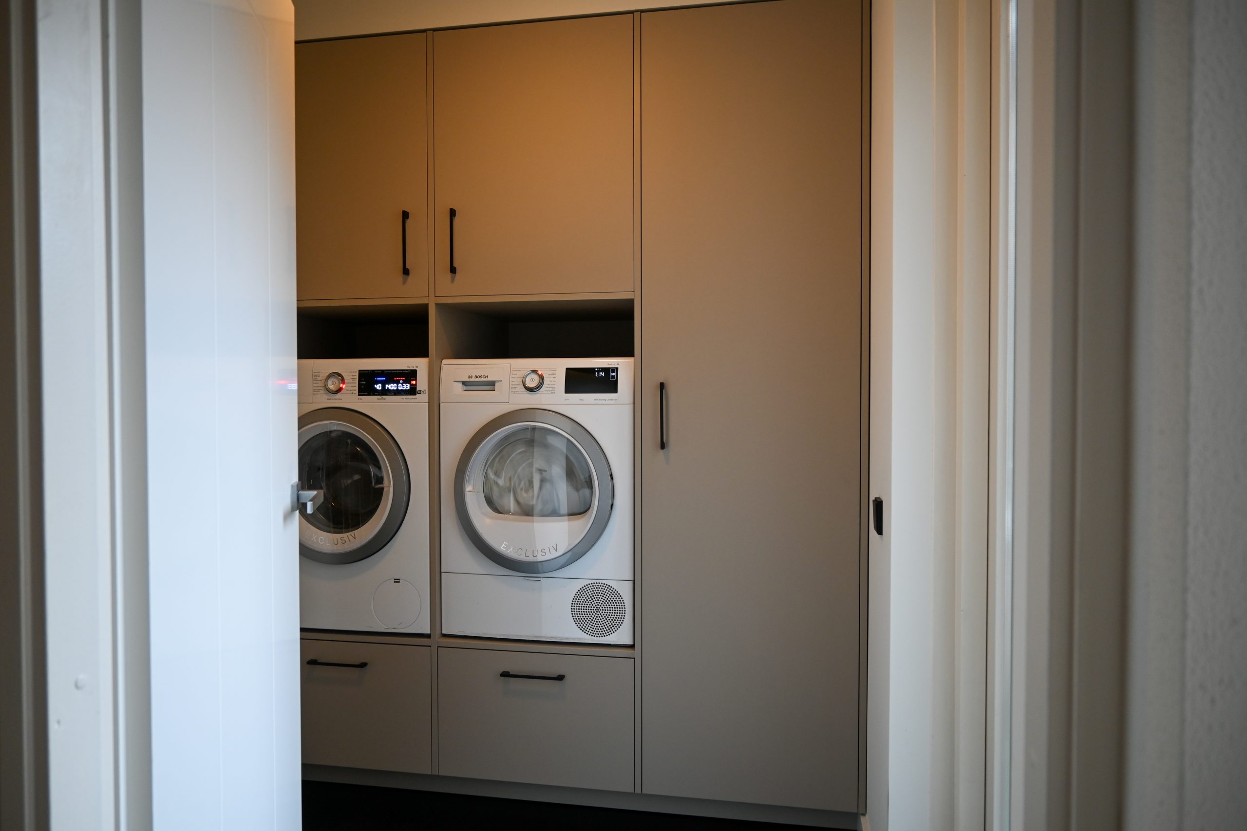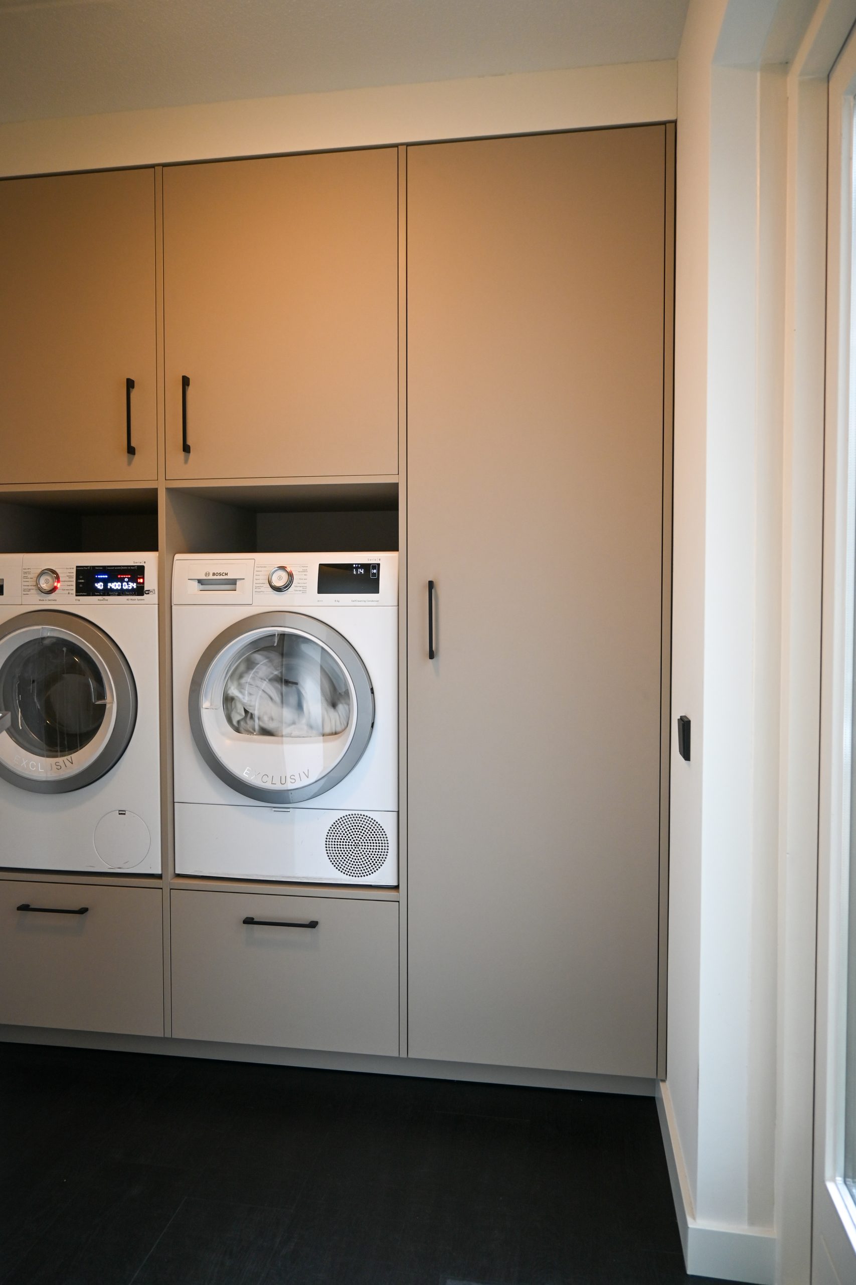 Deze wasruimte maakt het huishouden een stuk leuker! De kasten in Terra Grey geven een strakke look én veel bergruimte. En hoe fijn: de wasmachine en droger staan op hoogte, superhandig!