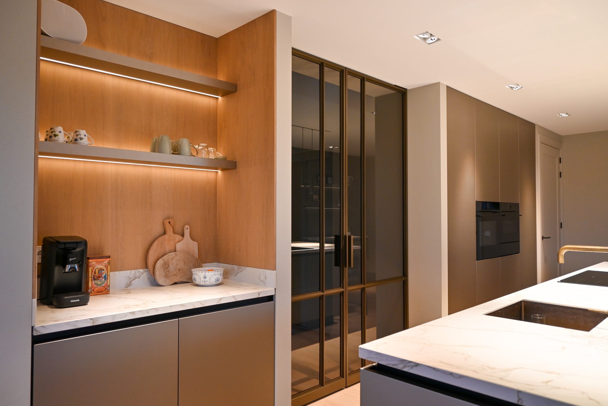 Deze keuken ademt rust en eenvoud. Het lichte composieten werkblad met een subtiele marmerstructuur en gouden accenten geeft een frisse uitstraling. De ruime lades en kastenwand zorgen voor volop opbergruimte – geen rondslingerende spullen meer, maar een strak en opgeruimd geheel.